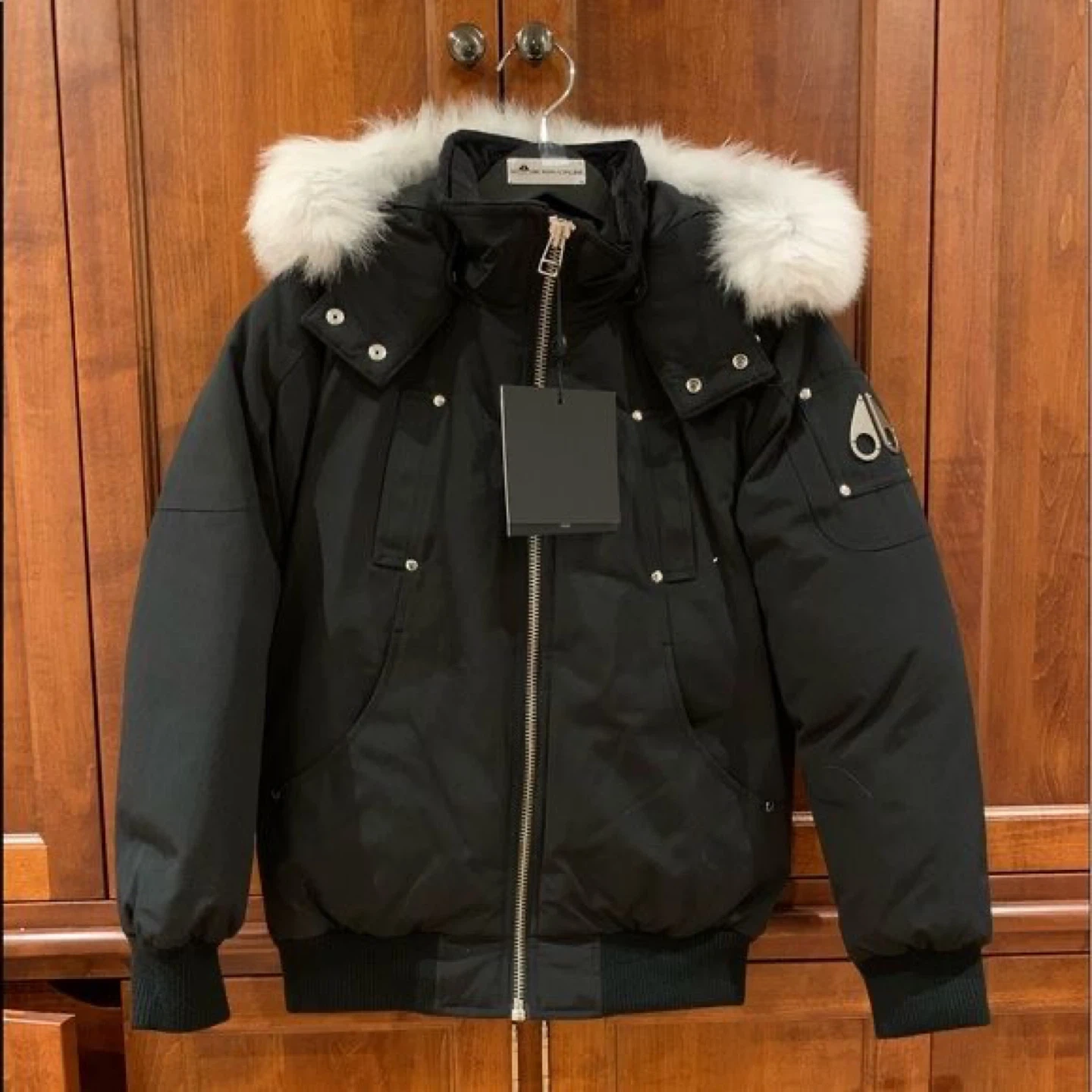 Selling a stylish Moose Knuckles bomber jacket in black. It features a fur-trimmed hood and the iconic metal logo on the sleeve. Perfect for staying warm and fashionable during the colder months!