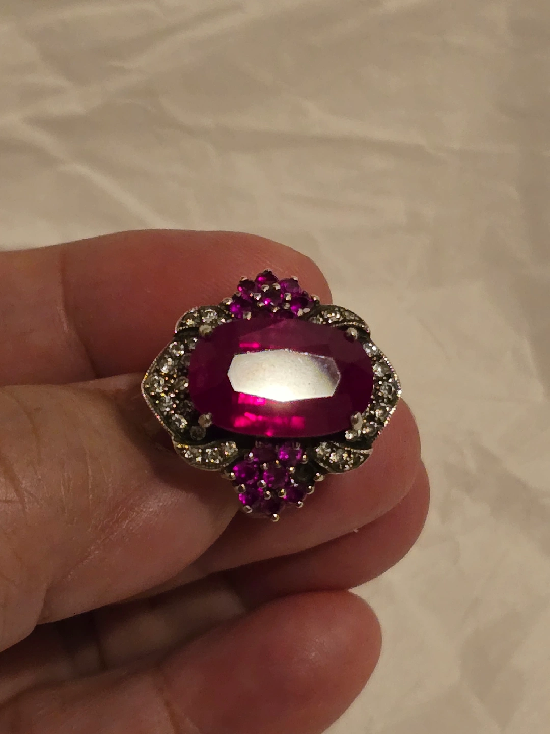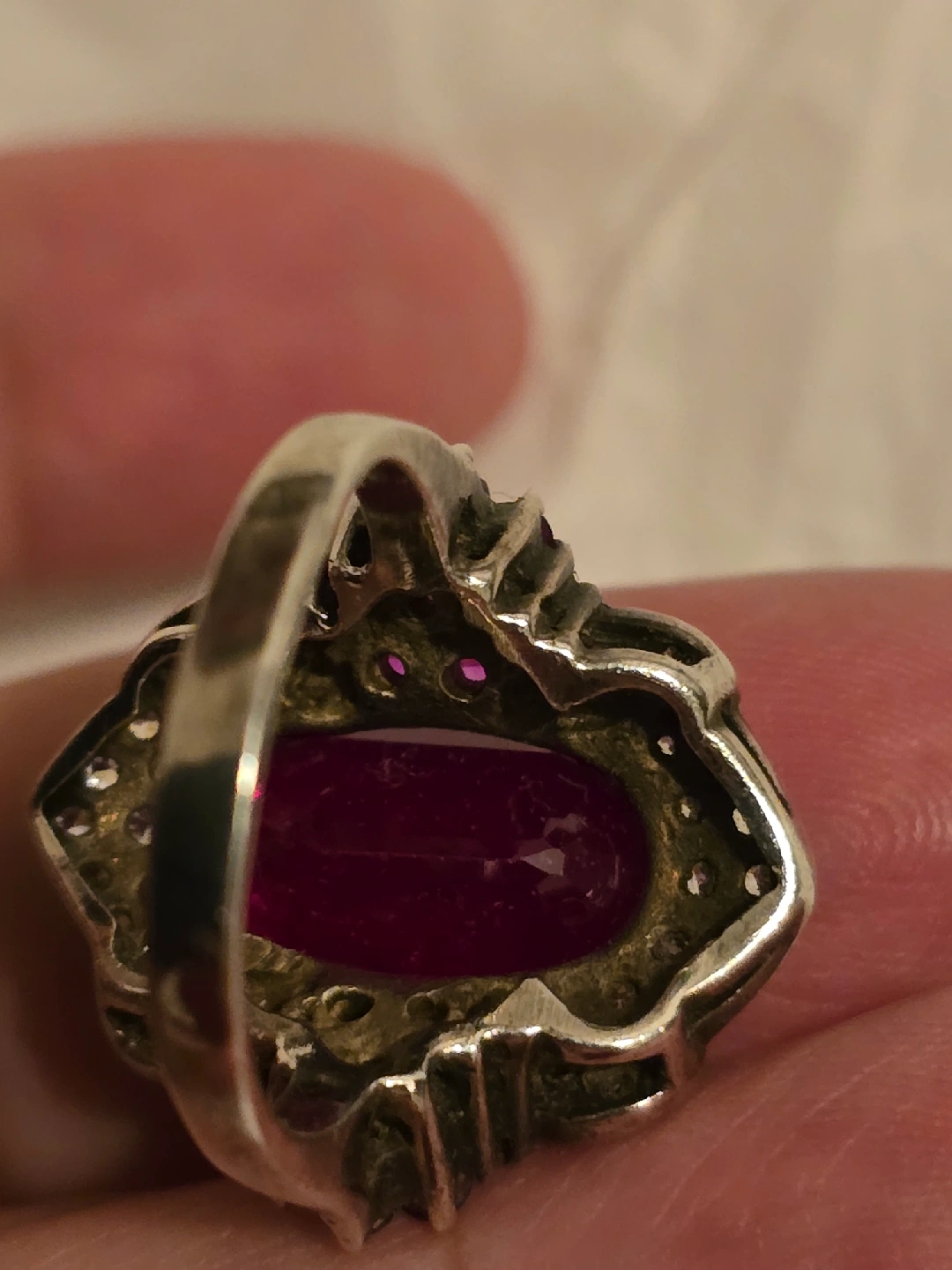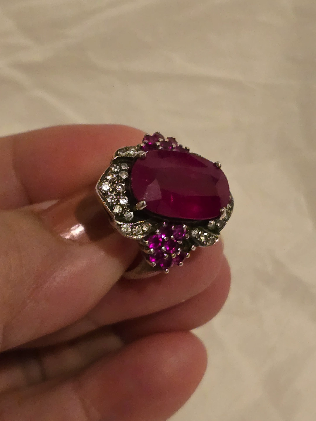 762Beautiful Glass ruby and sterling silver ring for sale! It features a large ruby stone surrounded by smaller crystal rubies and clear stones. The ring is in good condition and ready to be worn! I'm culling my stashes of fancy jewelries as my stay at home life needed more meds than blings to show. This is my prettiest ring ever and probably the prettiest you'll ever see in Ruby SS designed ring. You can ask for more than the suggested 280...just dm me. Not taking less than 280. please take it as Beautifully cut Glass , not natural Ruby although I bought it as lab ruby but no certificate so just take it as a lovely cut glass. The price is Firm. I have it for 25 years now bought from a wholesaler of gemstones and jewelry based in Thailand. 📌M1R1S1 beside Esso 📌 Can send in mail 📌Firm No Haggling at meet up. Let's be classy 👌 📌Pick up at Victoria Park Avenue and Surrey Esso ...easy coming by car, walk or bus 📌Cash bills 📌please get out of your car for a smooth, safe and lovely transaction / meet-up. 🚗👍 🥰 Kindly check my profile and my pretty listings of souvenirs and goodies》》》 that's mostly ready for Gifting .Think of occasions and Christmas holidays for a unique gift. Thanks!