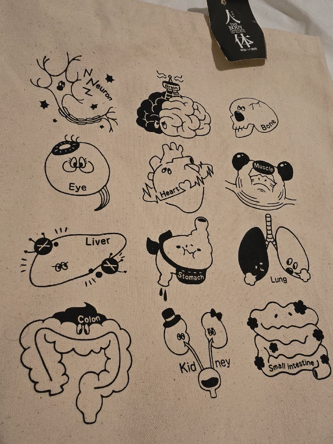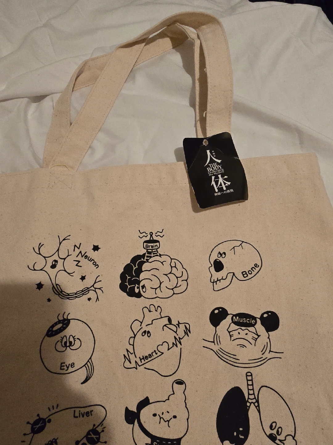 This is a cute tote bag from The Body Challenging the Mystery.y featuring various anatomical drawings! It's in great new.condition and ready for a new home