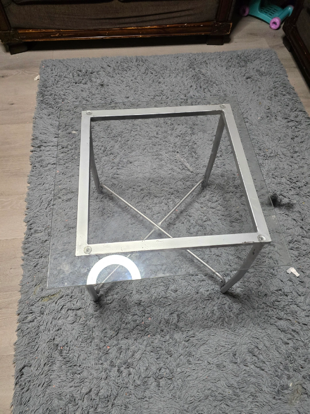 Selling a square coffee table with a glass top and silver-tone metal frame. It's in good condition and would be a nice addition to any living room or sitting area