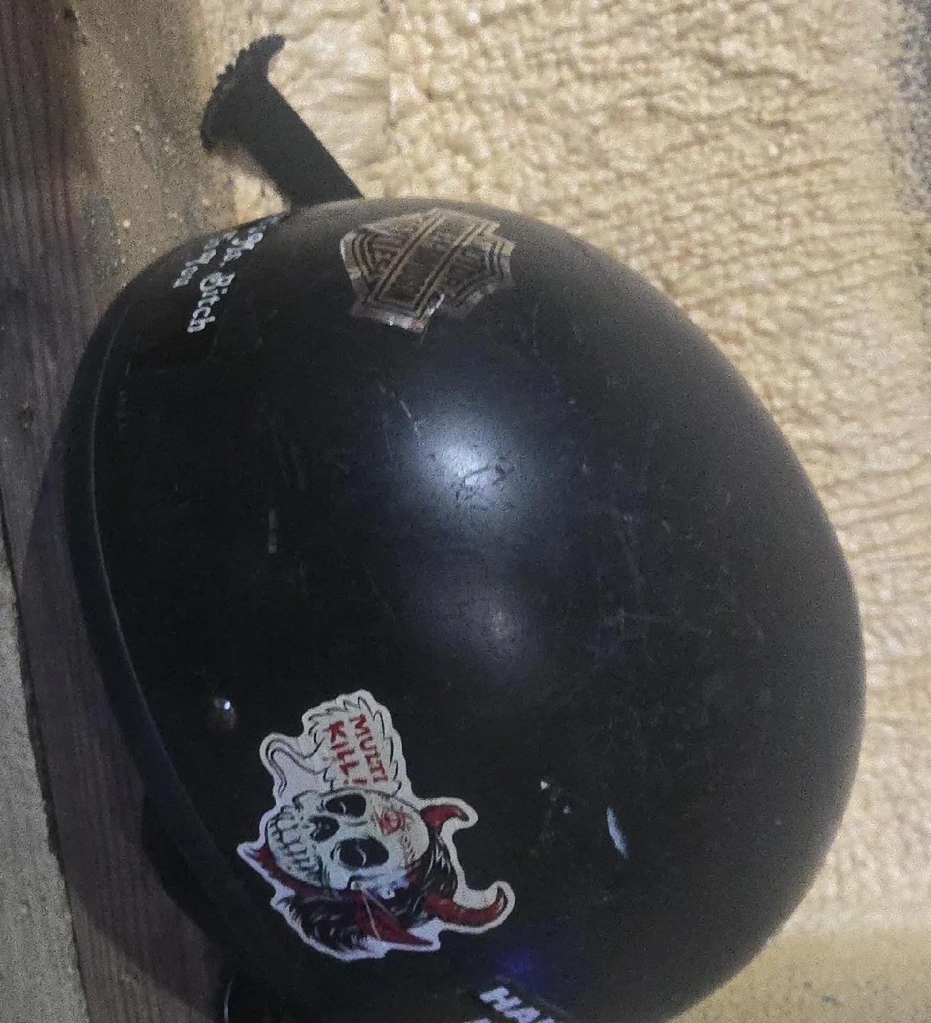 Selling a black helmet that would be great for motorcycle riding or other activities! It has a Harley Davidson logo on it, along with some other stickers. There are some minor signs of wear.