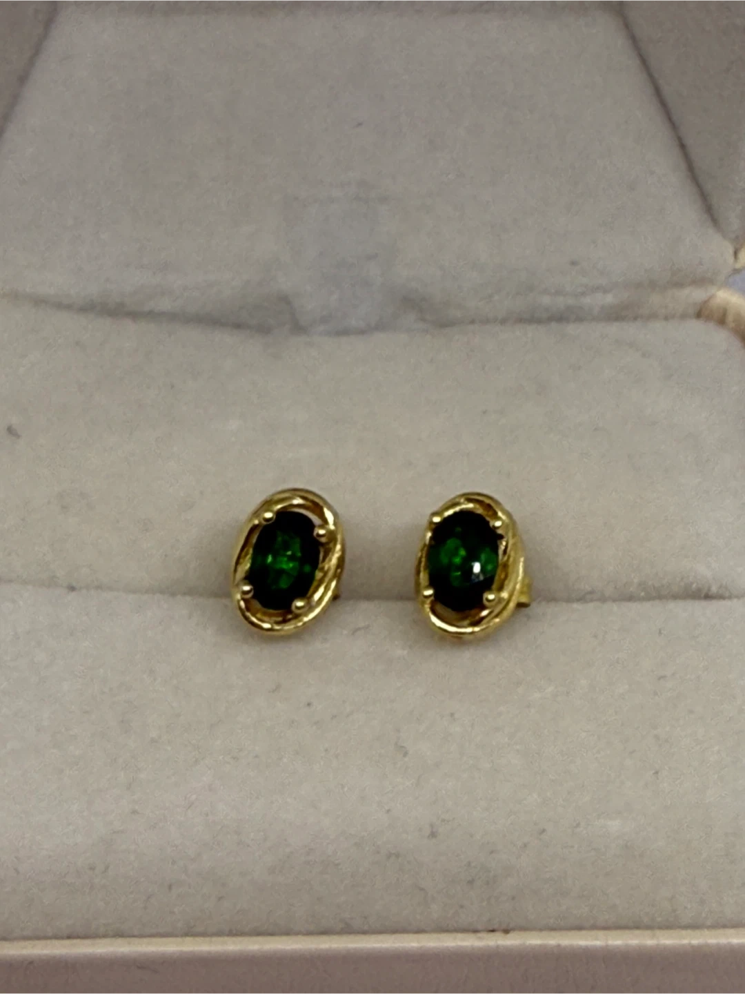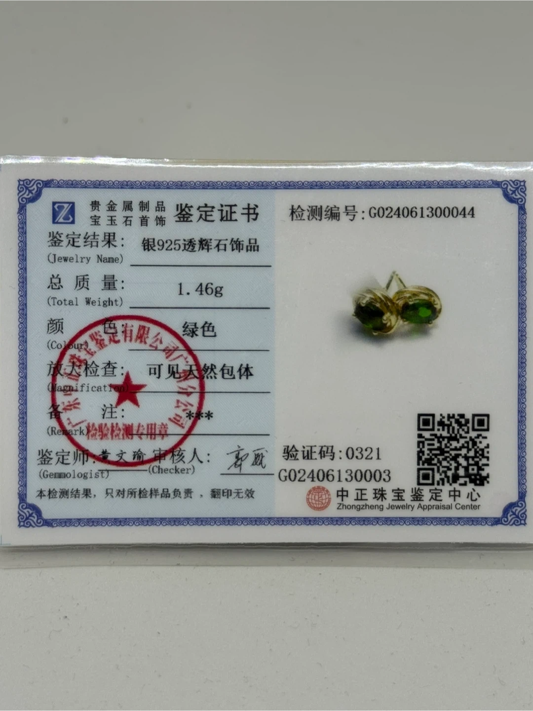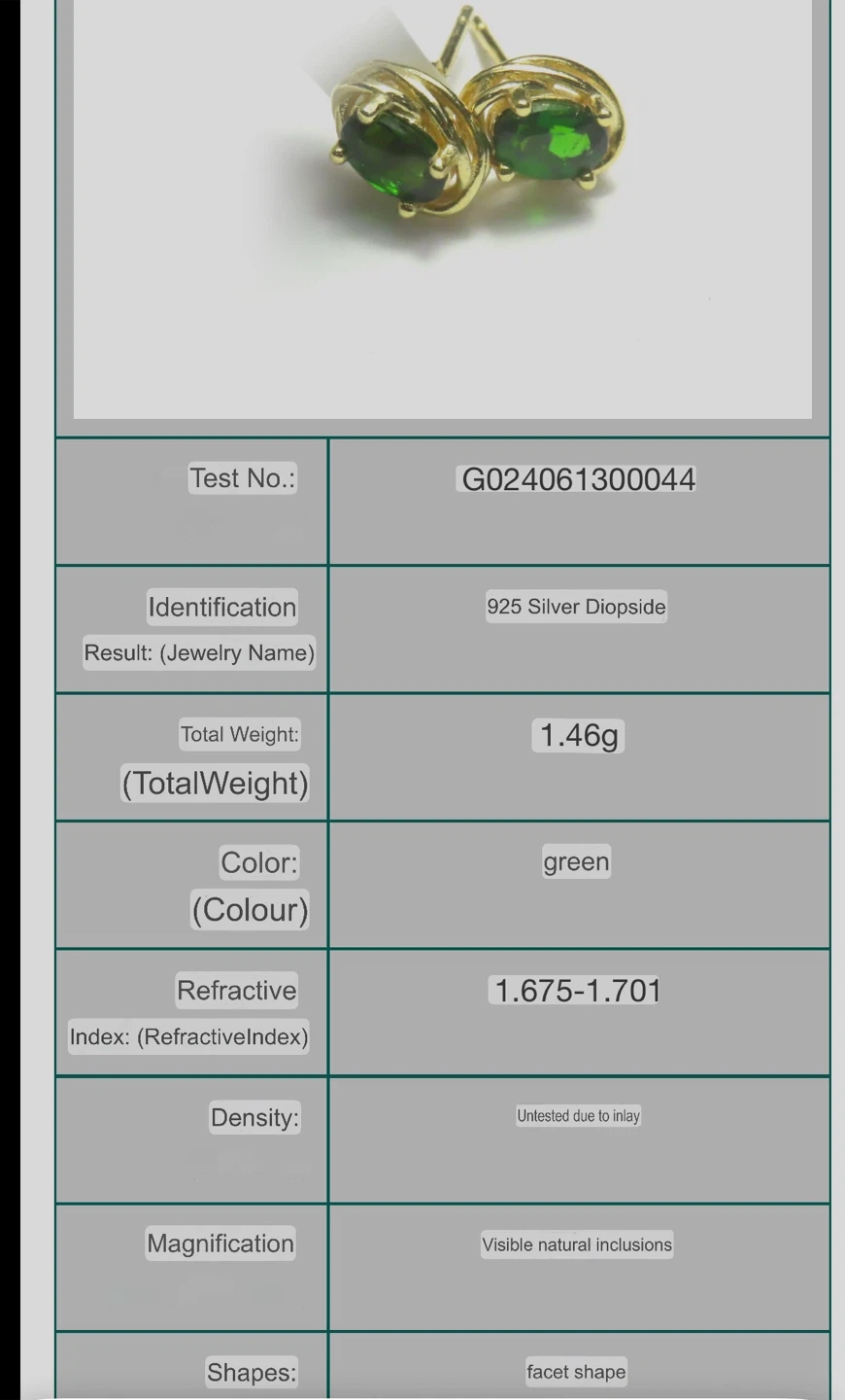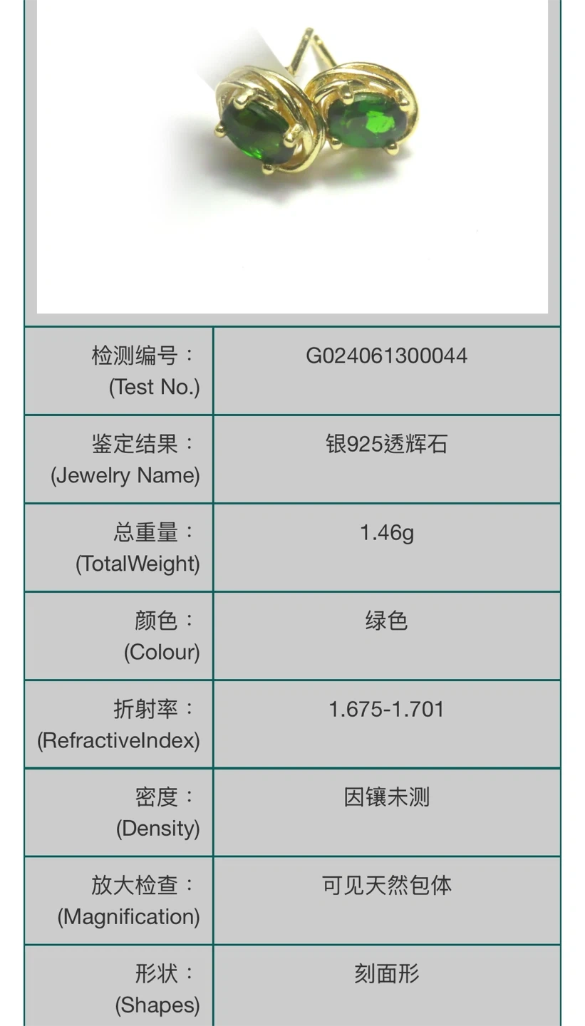 These are a pair of lovely S925 diopside earrings in gold silver setting. They feature a beautiful green colour and have a total weight of 1.46g. The shapes are facet shape, and magnification shows visible natural inclusions.