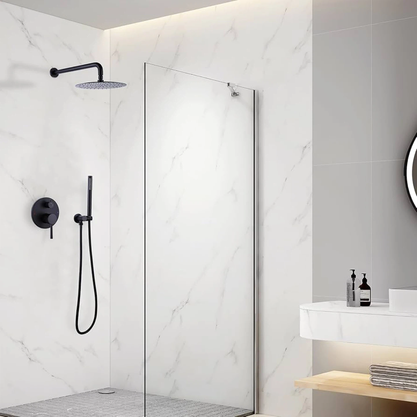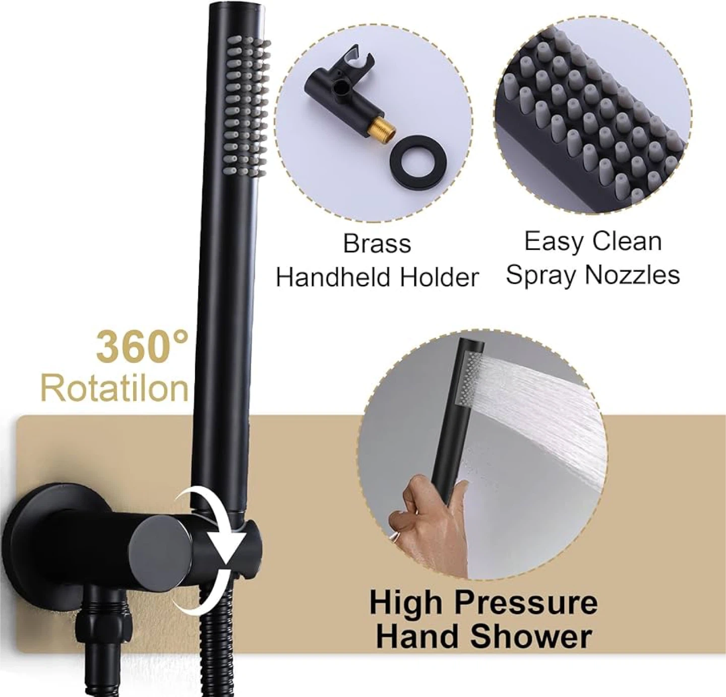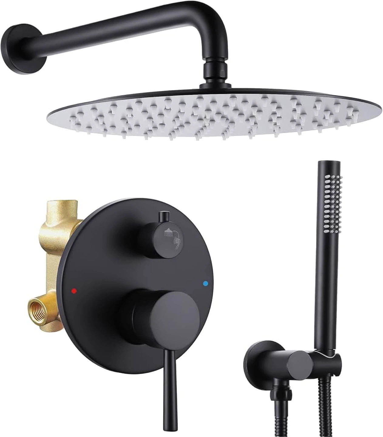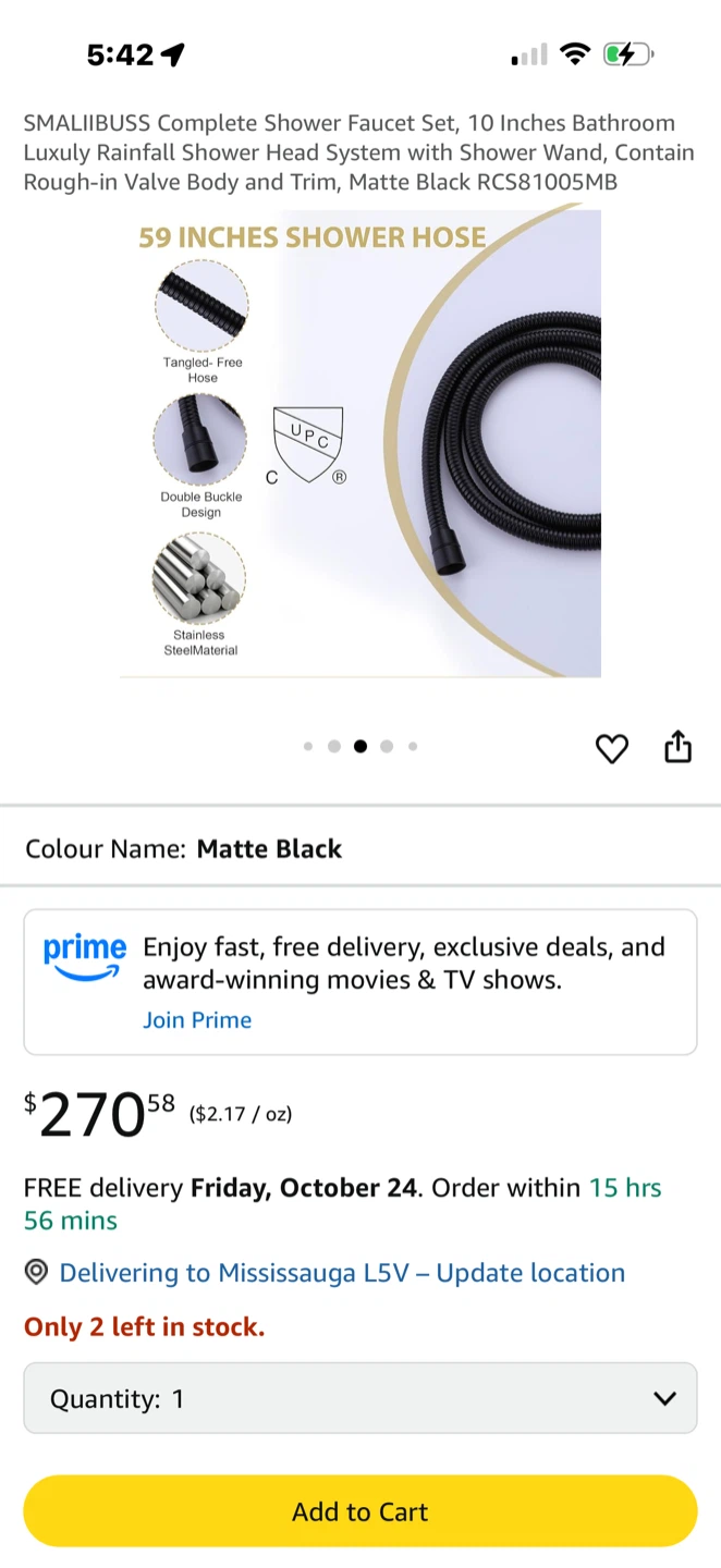 Looking to upgrade your bathroom? I have a SMALIBUSS complete shower faucet set in matte black. It features a 10-inch bathroom luxury rainfall shower head system with a shower wand. The shower hose is 59 inches long and tangle-free. It also has easy-clean spray nozzles.