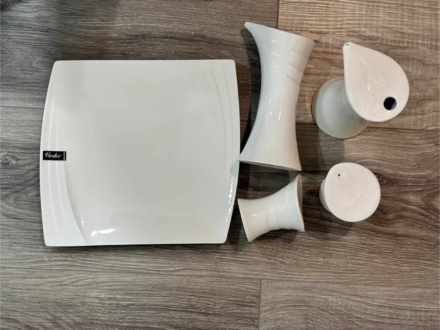 Selling a lovely Verdice Design condiment set in white. It includes a square plate, two condiment jars, and two matching lids. Perfect for adding a touch of elegance to your dining table!