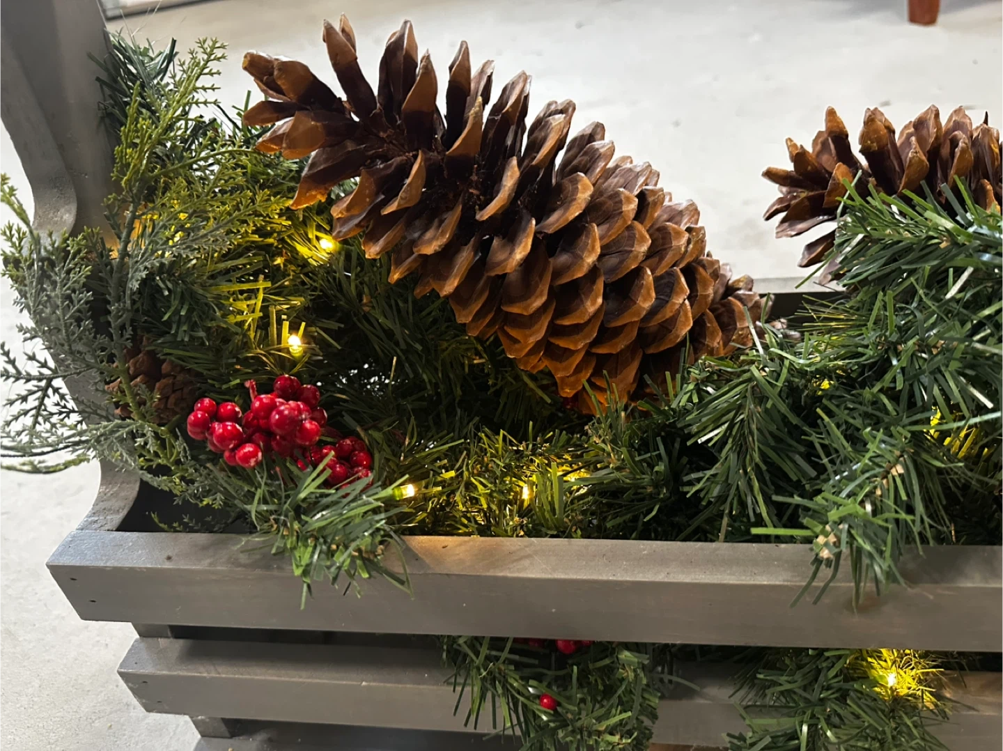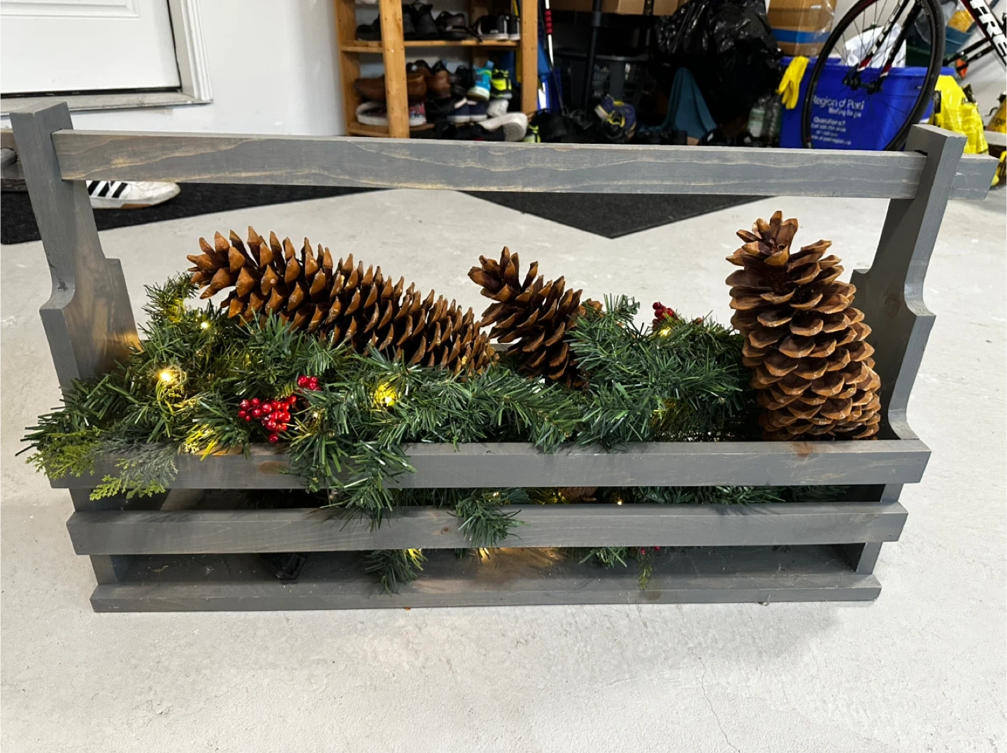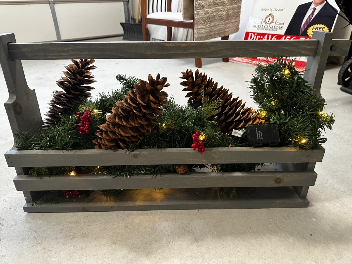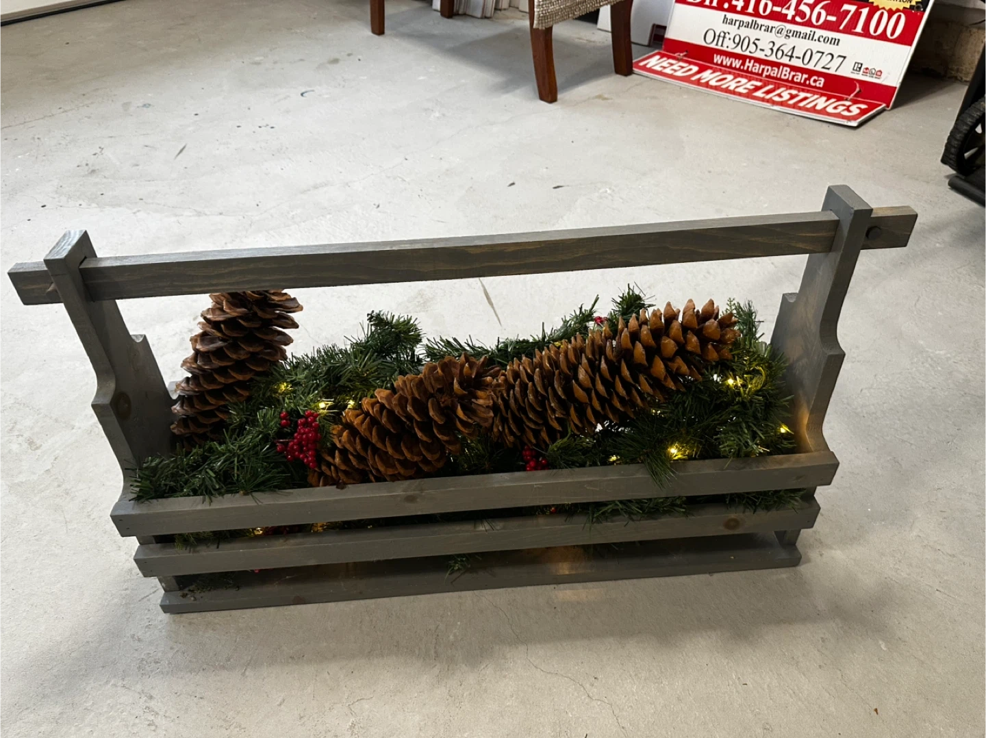 Spruce up your home with this charming wooden basket filled with festive holiday decor! It features pinecones, greenery, and little red berries, all nestled in a rustic grey wooden basket. Perfect for adding a touch of cozy Canadian winter to any room
