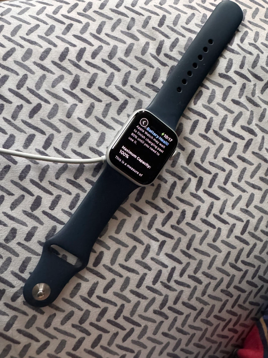 Selling an Apple Watch SE 40MM ALUMINUM 32GB with a blue band in great condition! The battery health is at 100%, so it's ready to go for a new owner. It comes with a charger as well No Box we lost it.