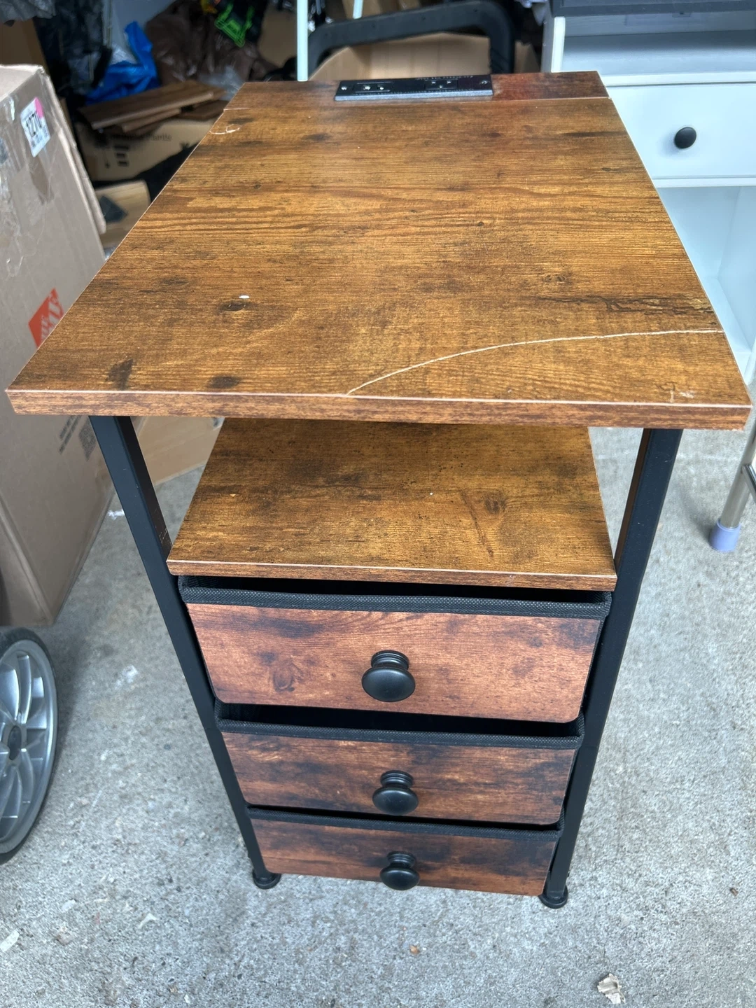 This brown wood nightstand is perfect for your bedside! It features three drawers for storage and convenient USB ports on top for charging your devices. It's in good condition and ready to use in your home. Some damage but nothing that stops it from working