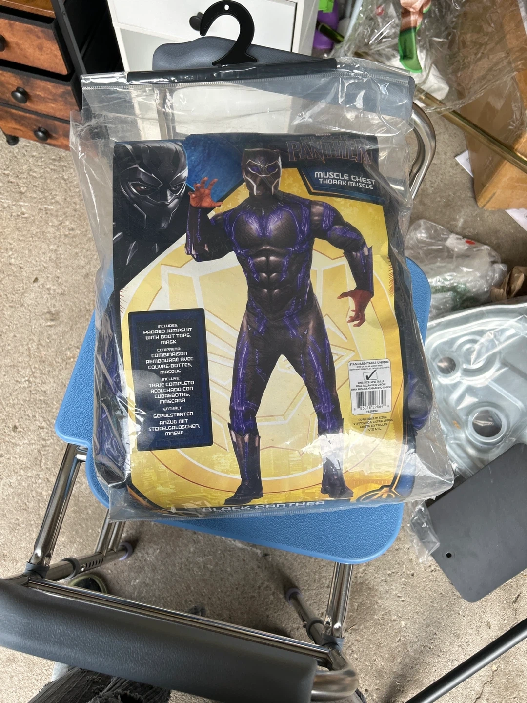 Selling a Black Panther muscle chest costume! It includes a padded jumpsuit with boot tops and a mask. Perfect for Halloween or dress-up!