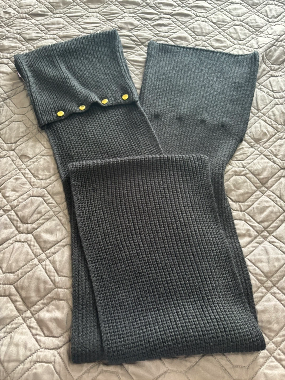 Selling a cozy Michael Kors knit scarf in a lovely grey colour. It's made of 70% acrylic and 30% wool, so it's sure to keep you warm! The scarf measures approximately 9 inches wide and 90 inches in length and has pockets on both sides.