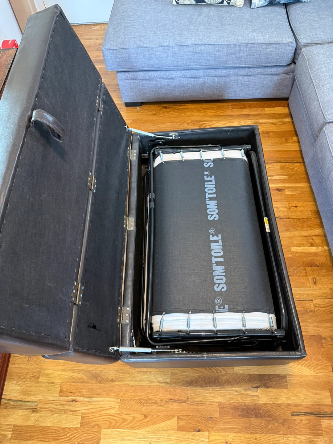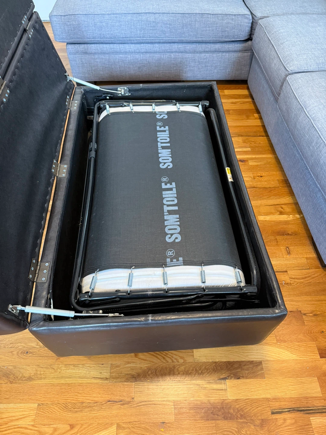 Selling a SomiToile ottoman sleeper! It's in good condition and ready for a new home. This versatile piece can serve as an ottoman and easily transforms into a comfortable sleeper when needed. Perfect for guests or small spaces!