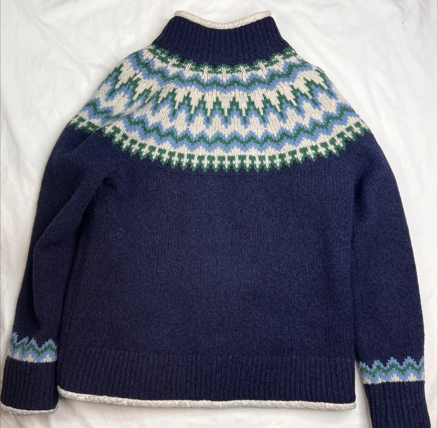 That's a brand new L.L.Bean lambswool zip cardigan sweater (Item #506106, Bright Navy, size M) - made of 100% lamb's wool with a sherpa-style polyester lining and cotton-lined sleeves. This is a high-quality, cold-weather Nordic/Fair Isle-style cardigan