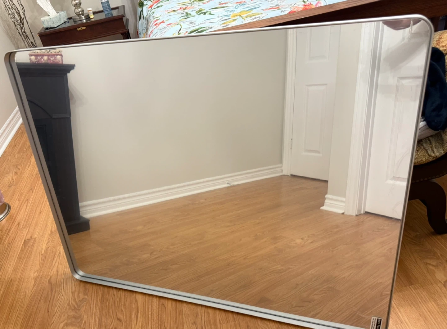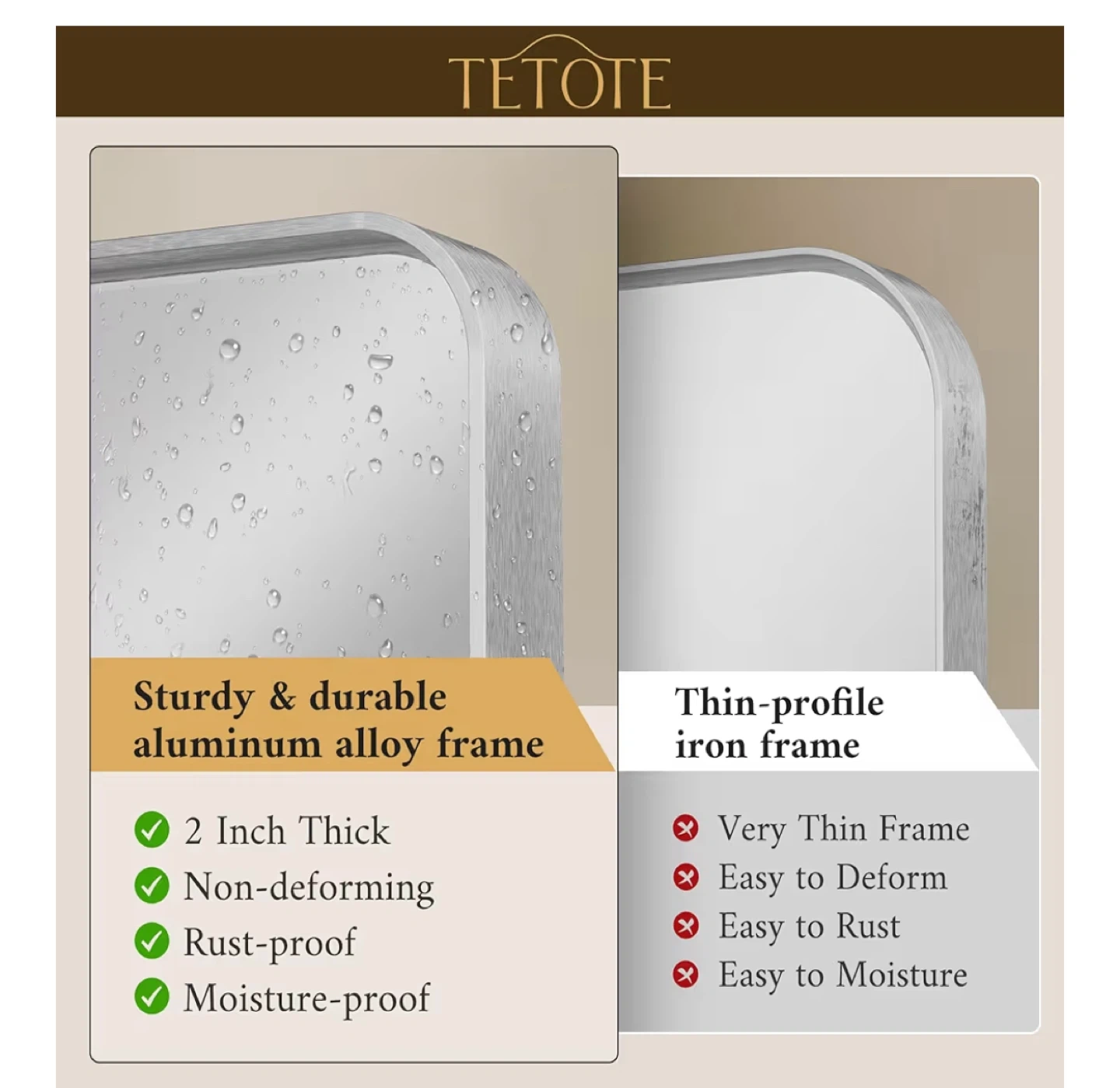New without box. Selling a TETOTE bathroom vanity mirror. It measures 40 inches by 30 inches, perfect for a 36"-44" wide vanity. The frame is sturdy and durable aluminum alloy, 2 inches thick, non-deforming, rust-proof, and moisture-proof. Can be hung horizontally or vertically!