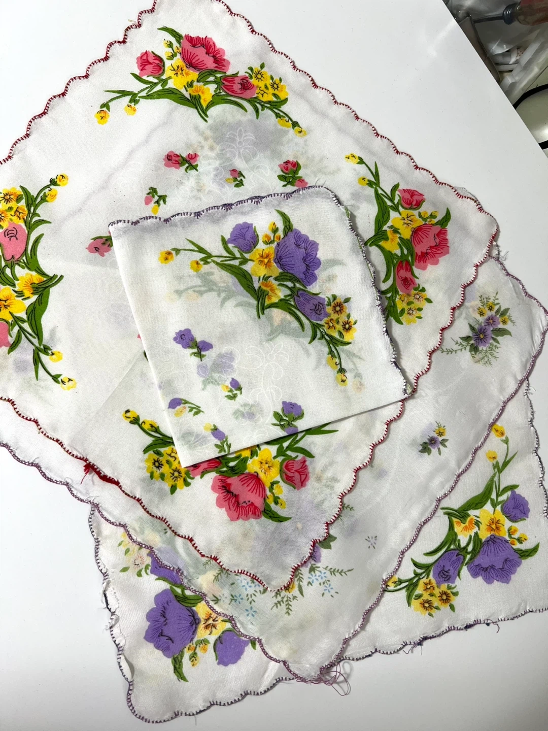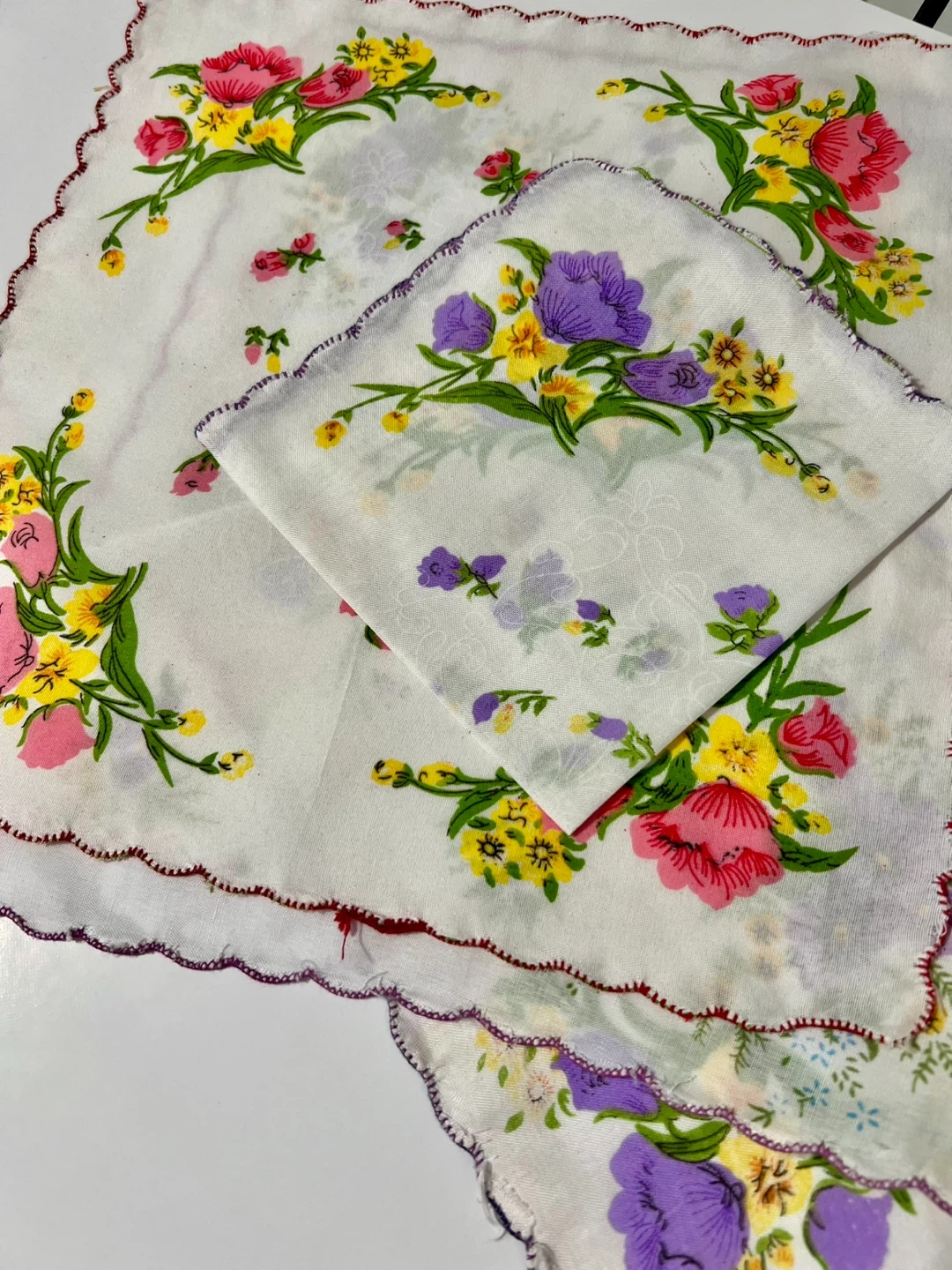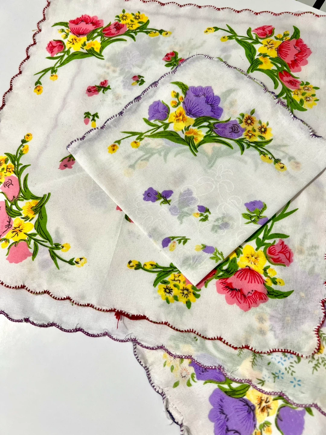 Selling a set of vintage floral handkerchiefs. They feature colourful floral designs on a white background and have a delicate scalloped edge. Perfect for adding a touch of vintage charm to your accessories!
