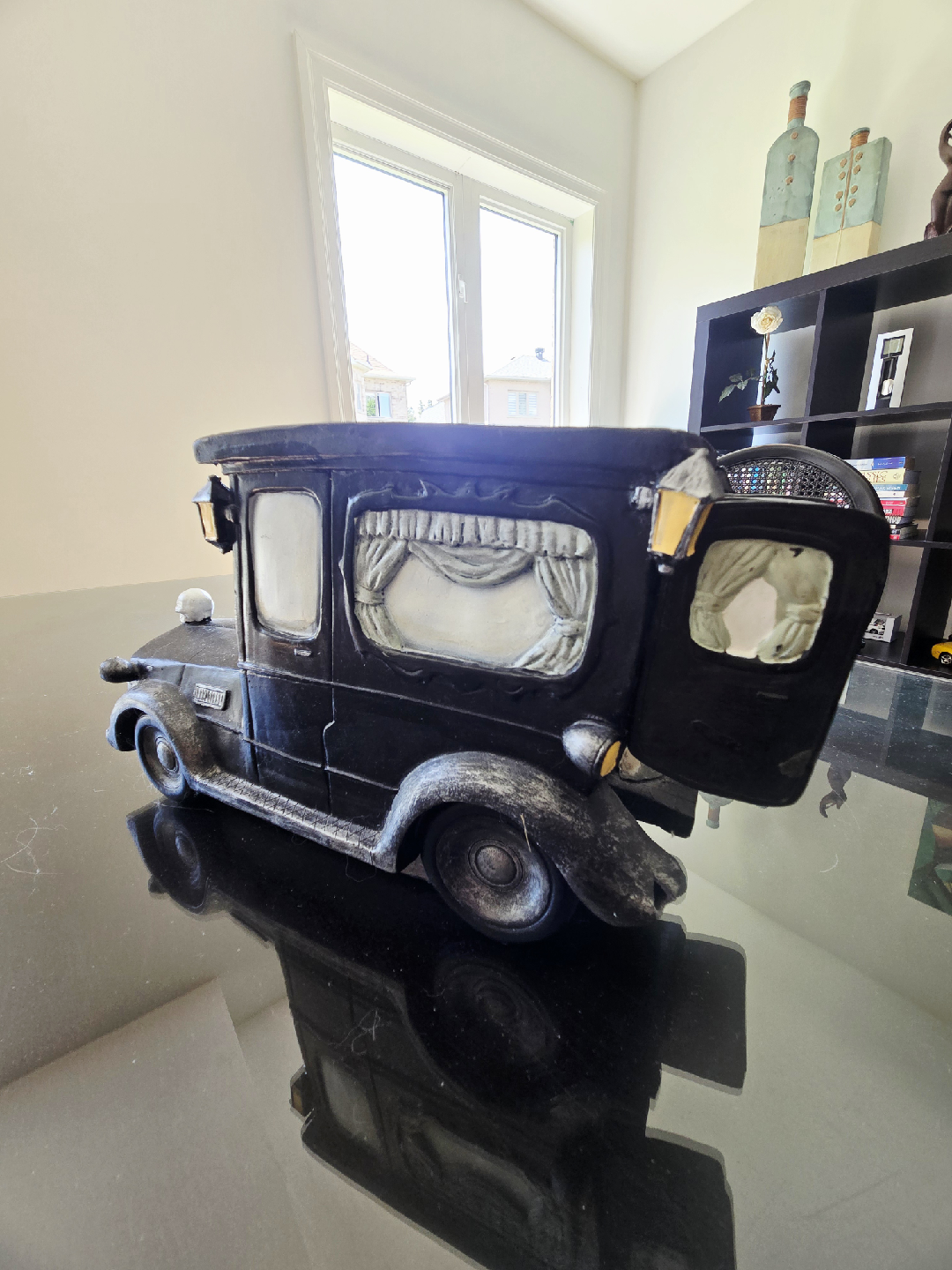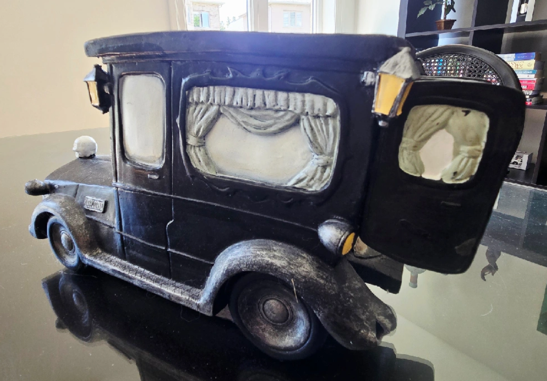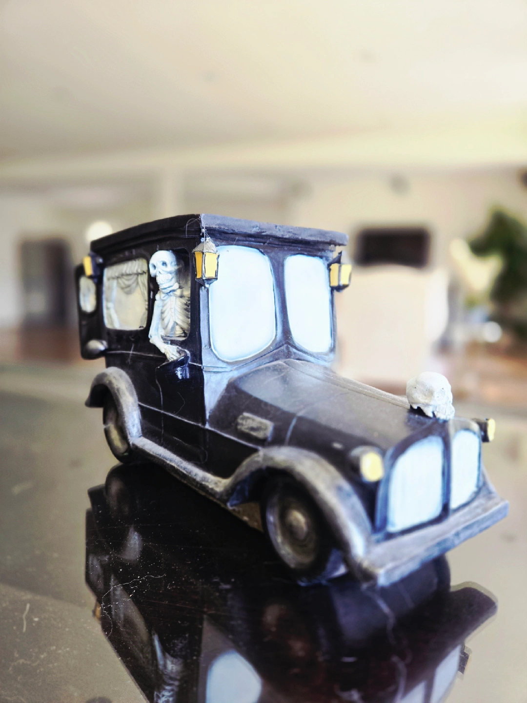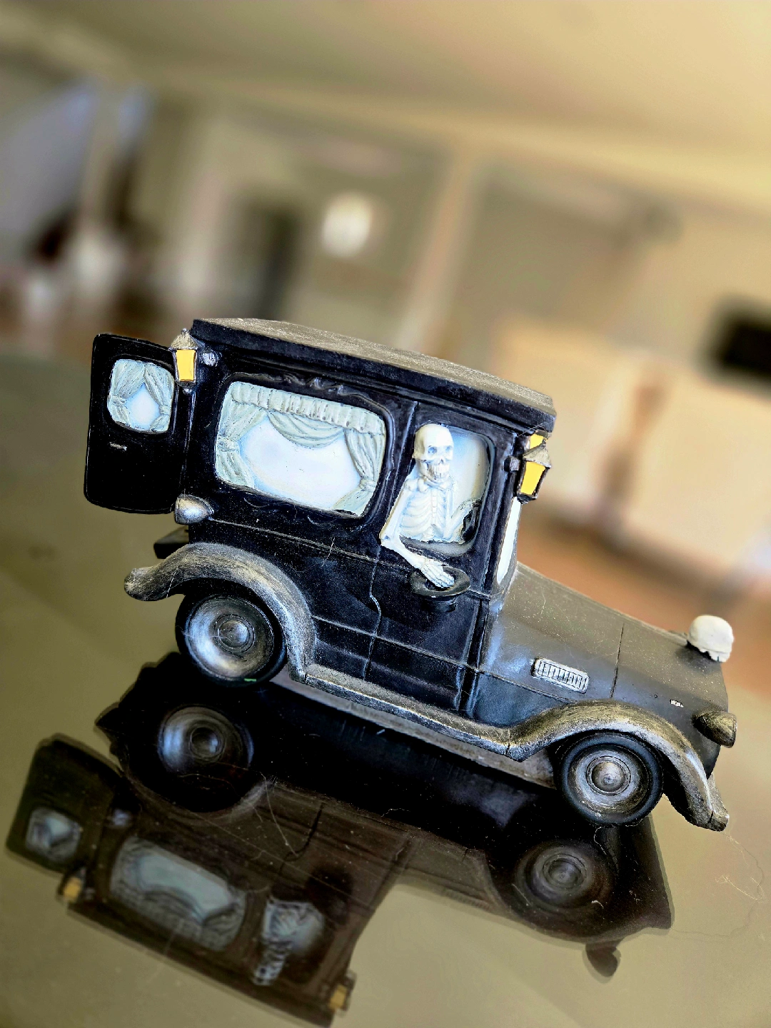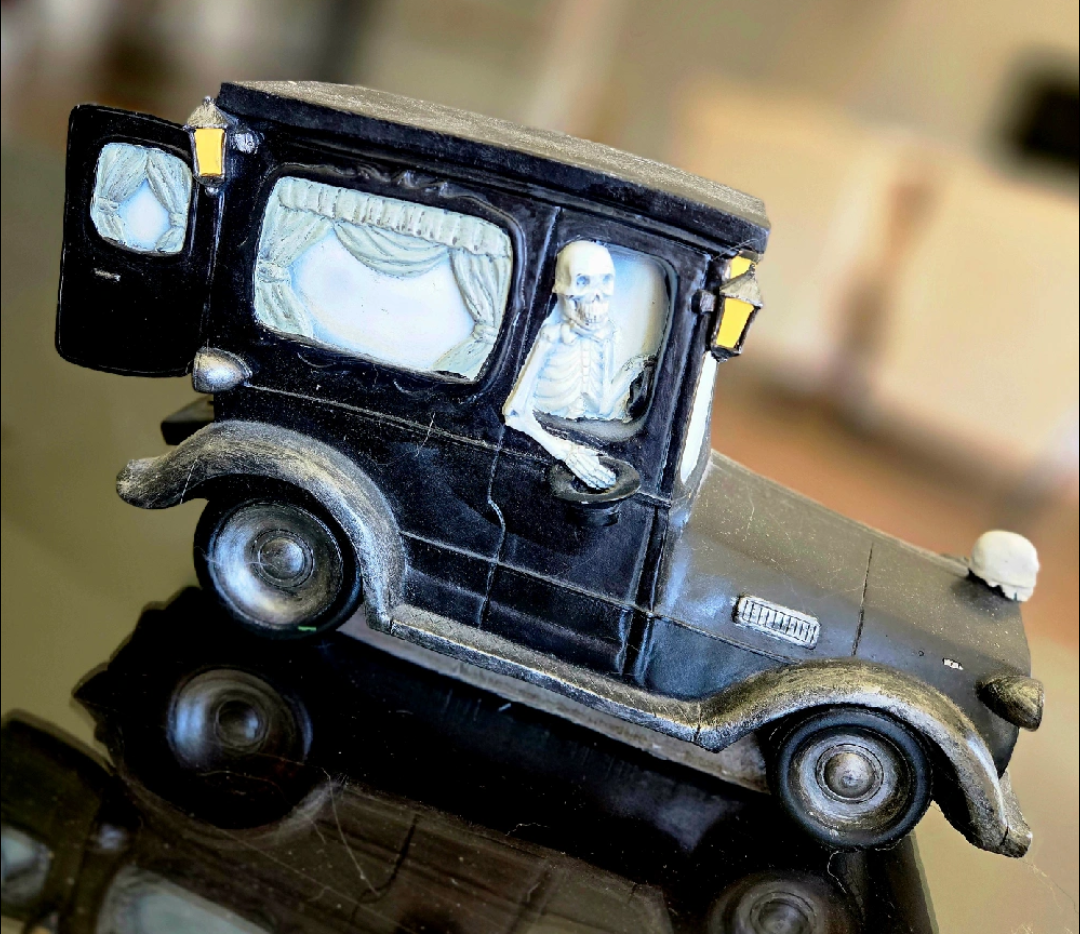 Spooky skeleton hearse decoration for Halloween! It's in great condition and ready to add some eerie vibes to your home this fall