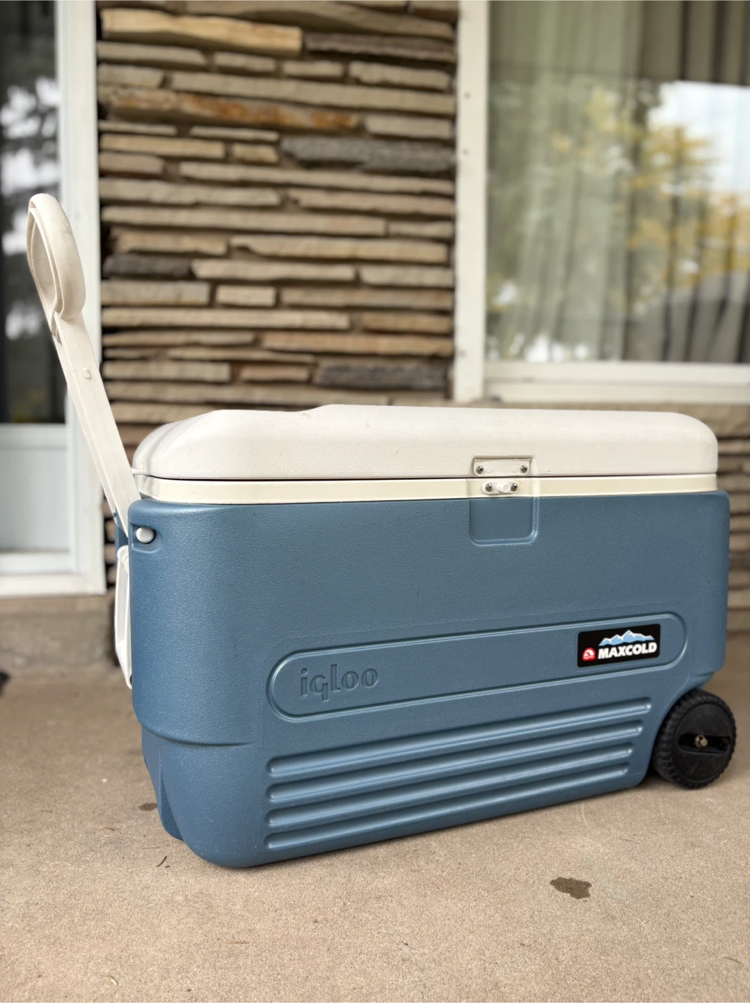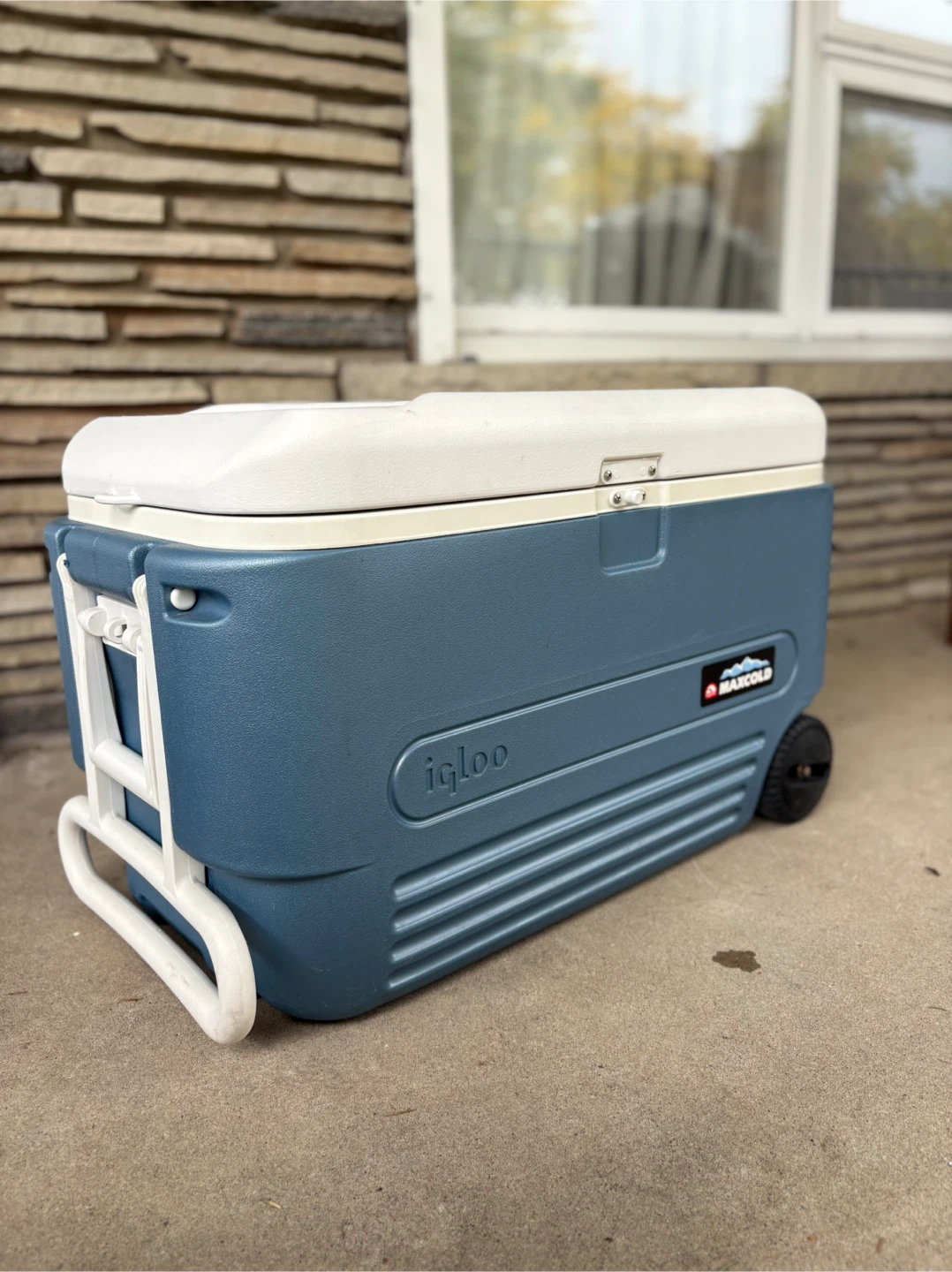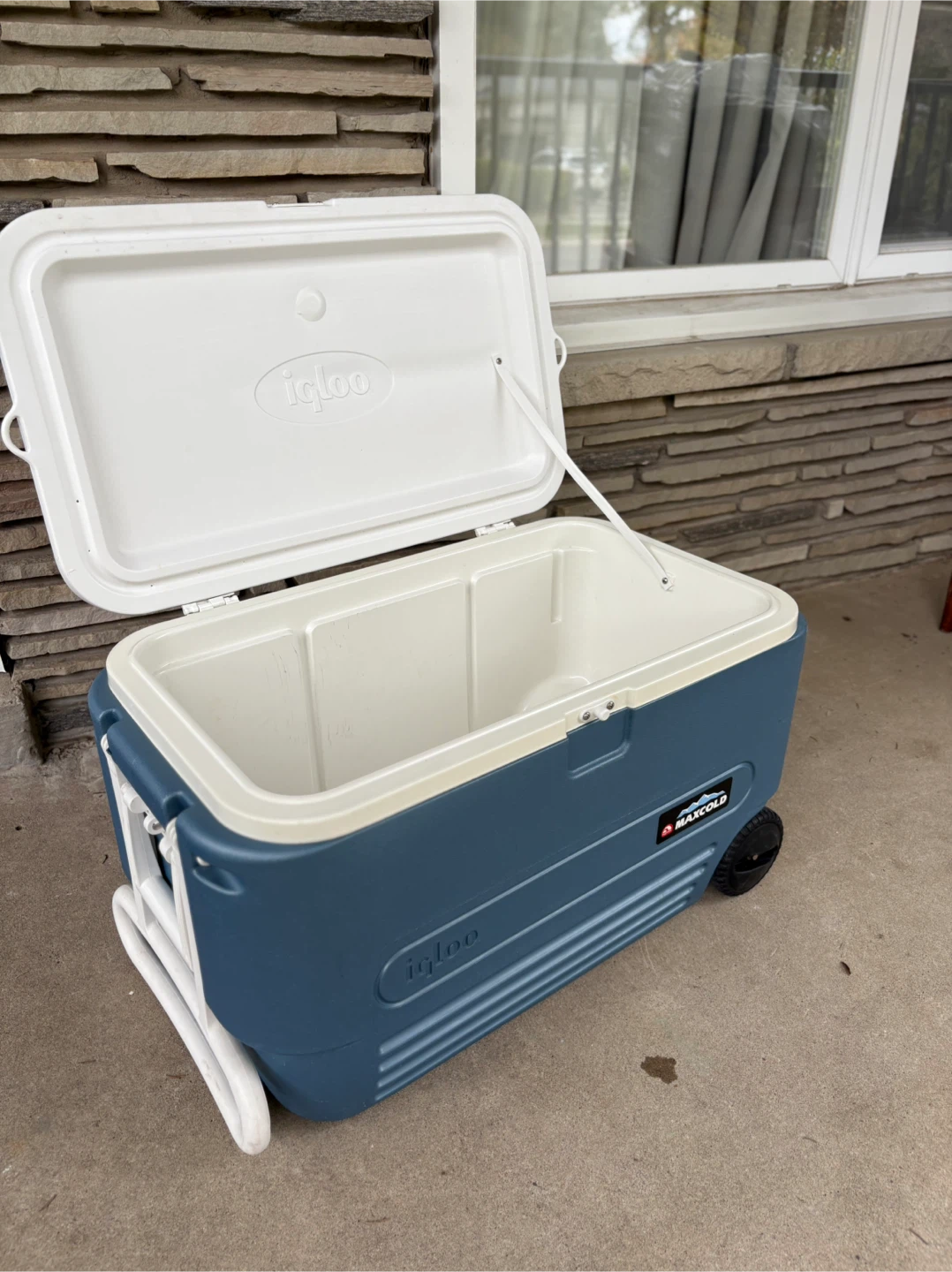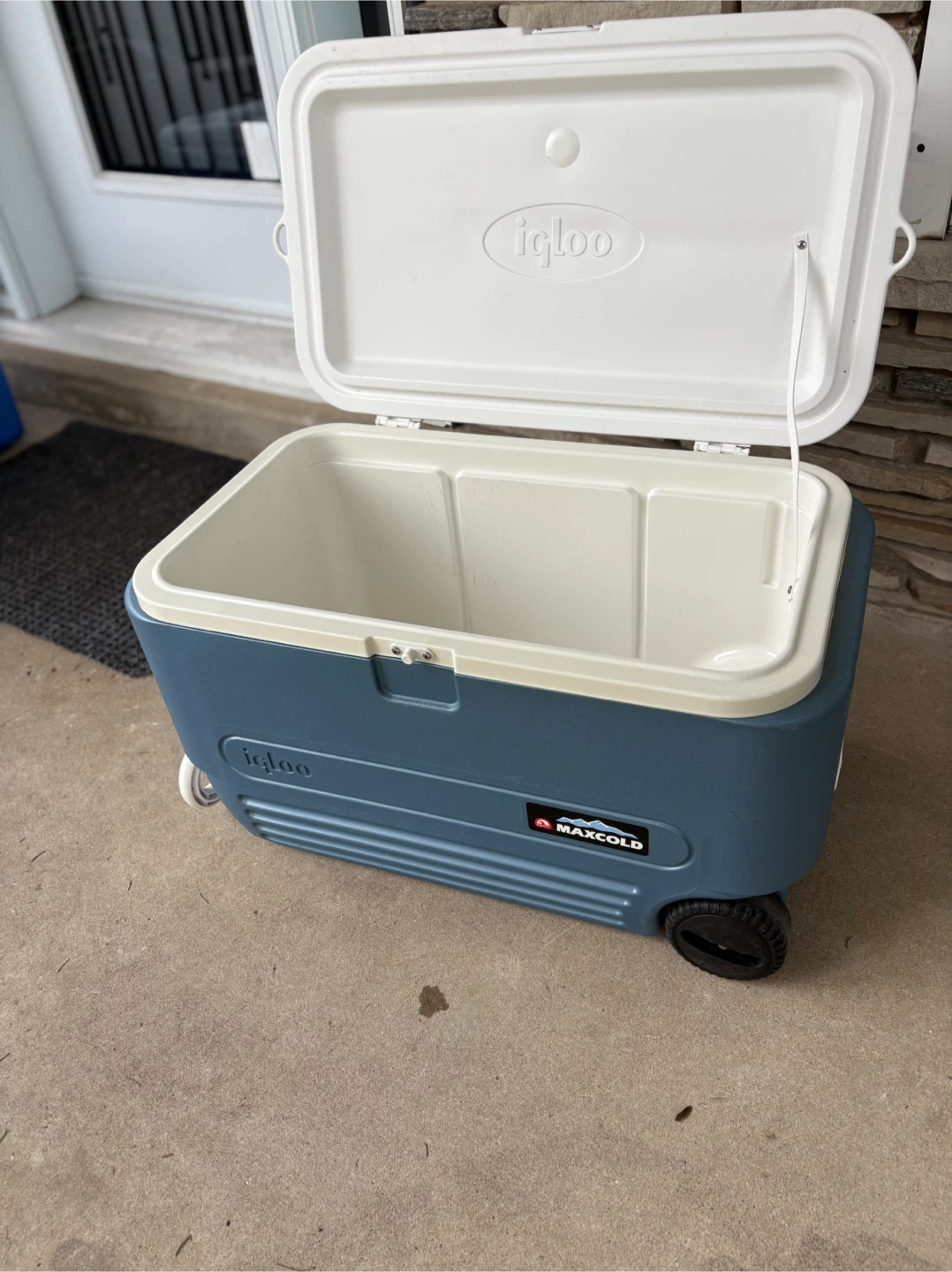 Selling an Igloo Maxcold cooler! It's blue and white and comes with wheels and a handle for easy transport. Perfect for camping, picnics, or any outdoor event where you need to keep things cool