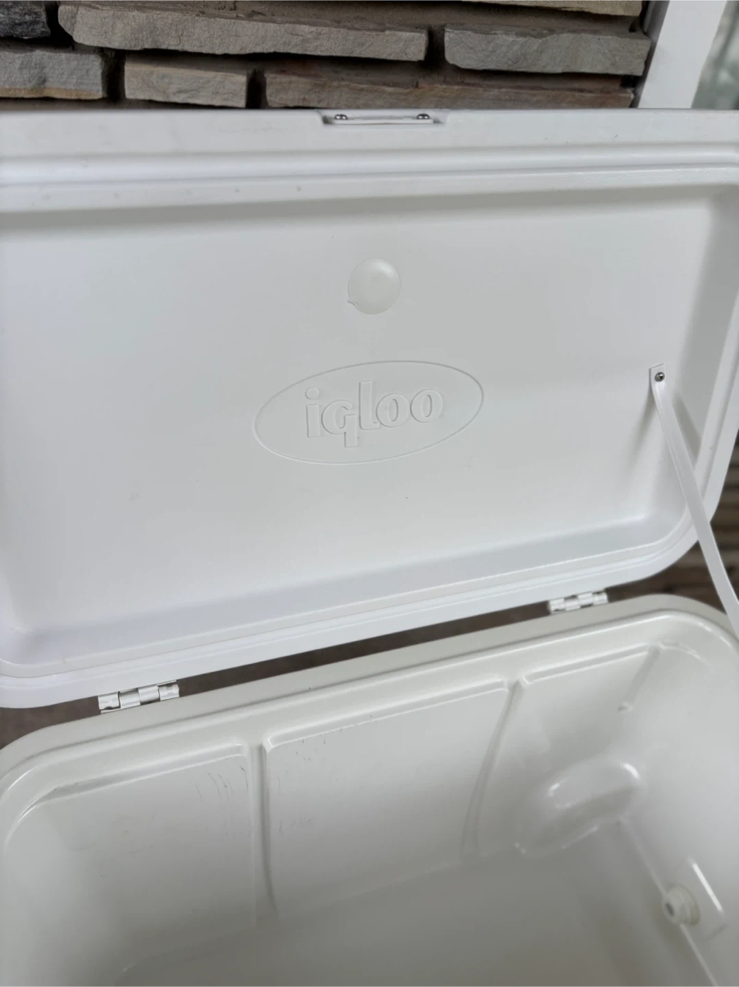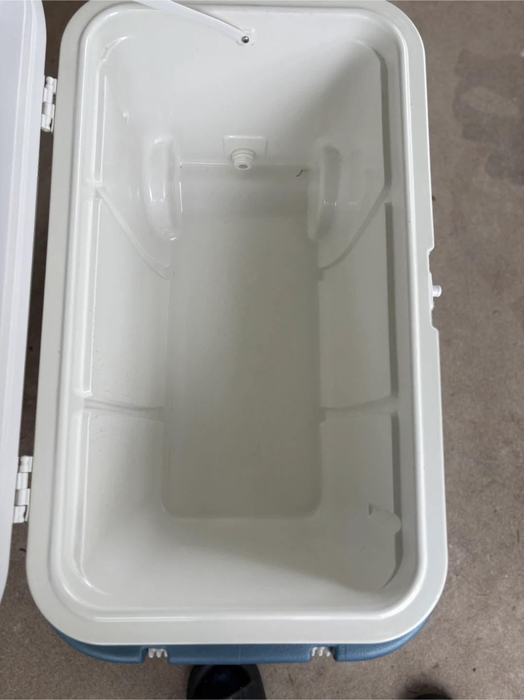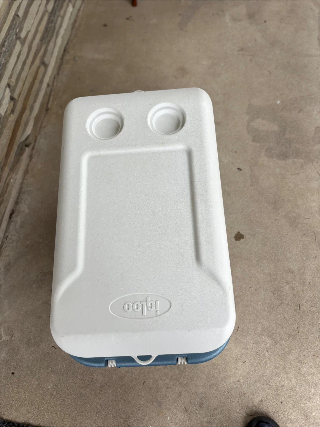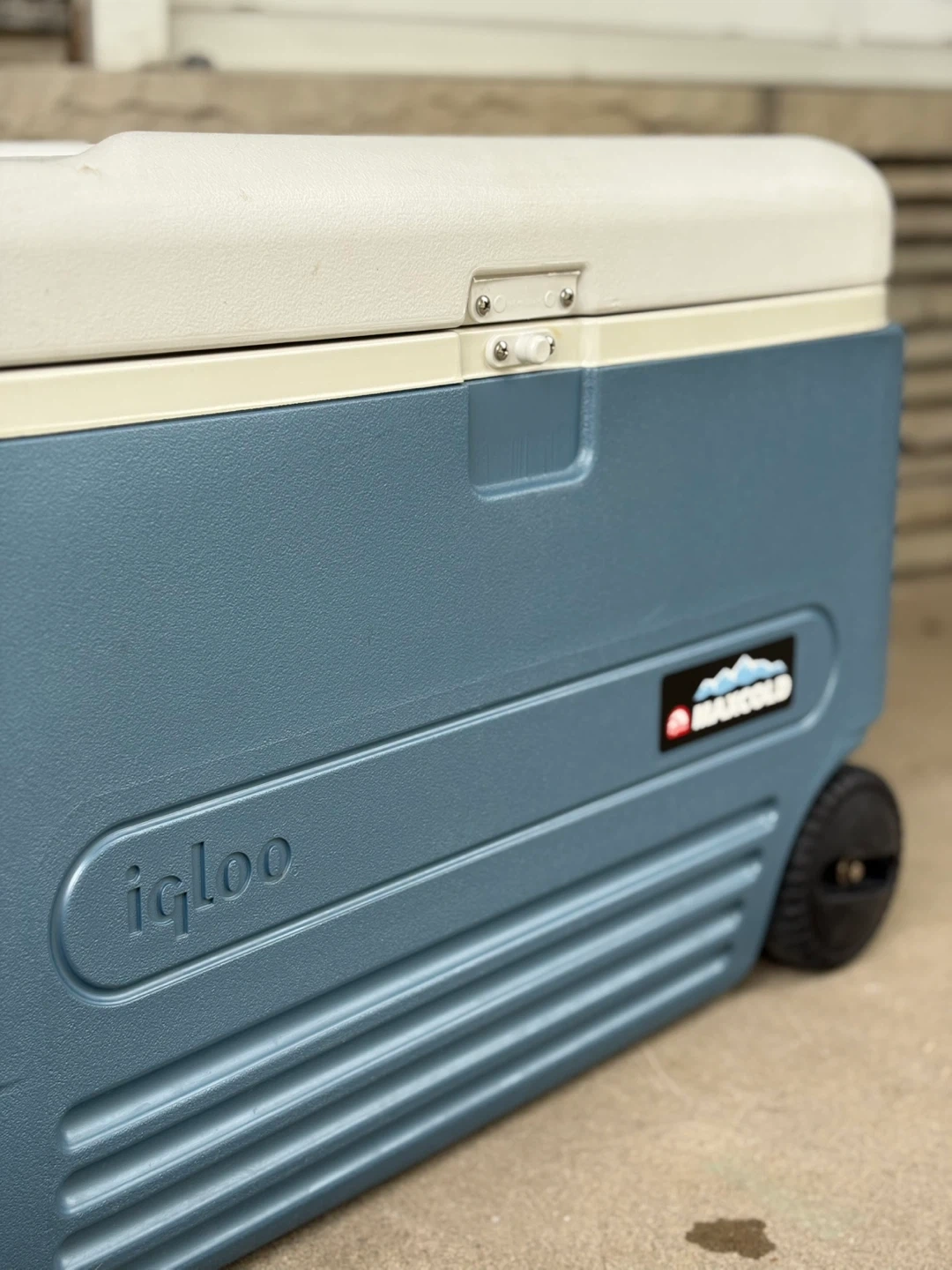 Selling an Igloo Maxcold cooler! It's blue and white and comes with wheels and a handle for easy transport. Perfect for camping, picnics, or any outdoor event where you need to keep things cool