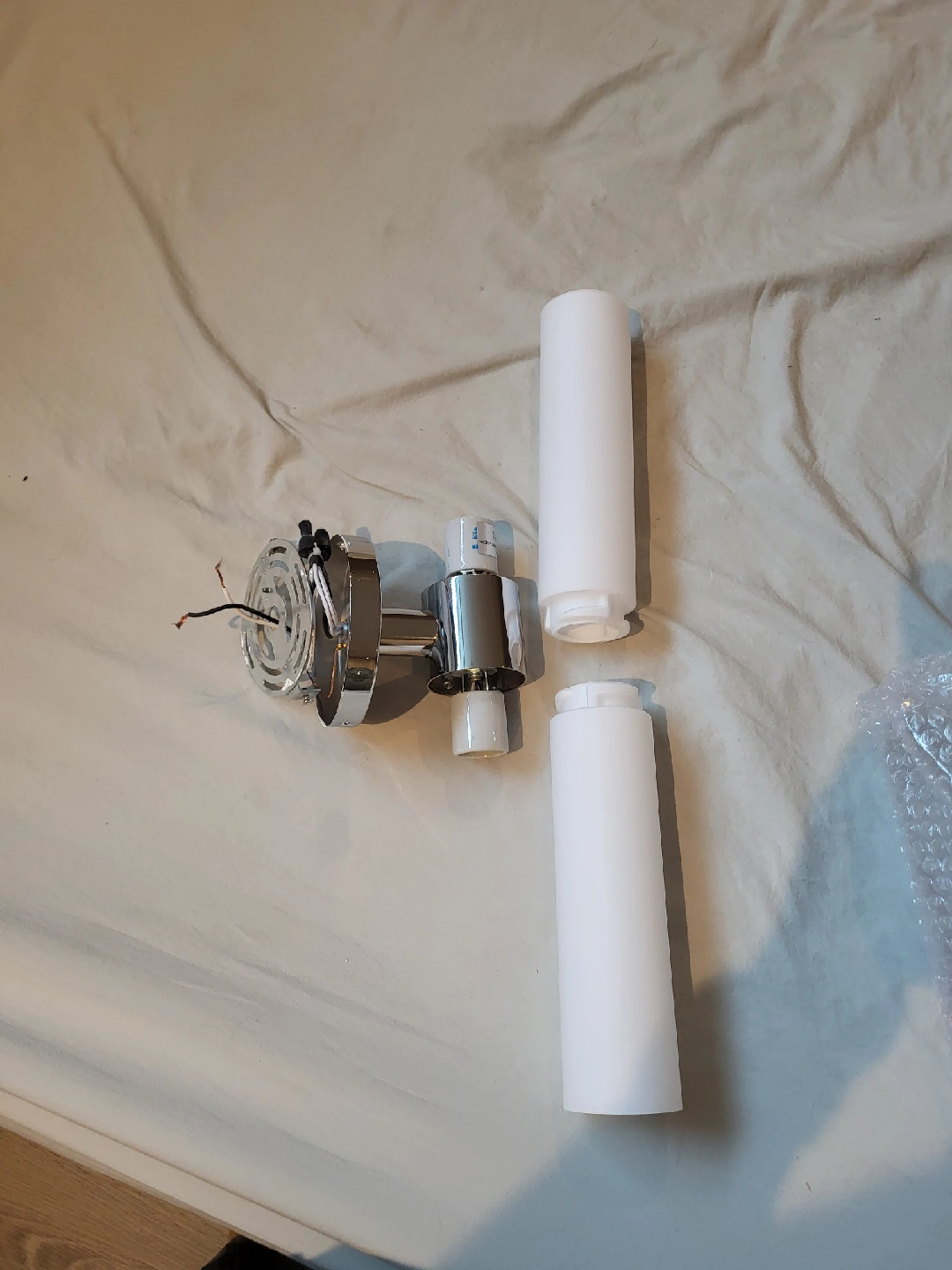 193Selling a wall light fixture. It has a chrome finish with white cylindrical shades. The fixture accommodates two bulbs. It's in good condition and ready to brighten up your space
