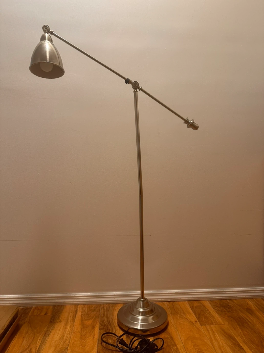 Selling a stylish adjustable floor lamp 48 “. It's in great condition and would look great in any room. The silver finish is neutral and modern.
