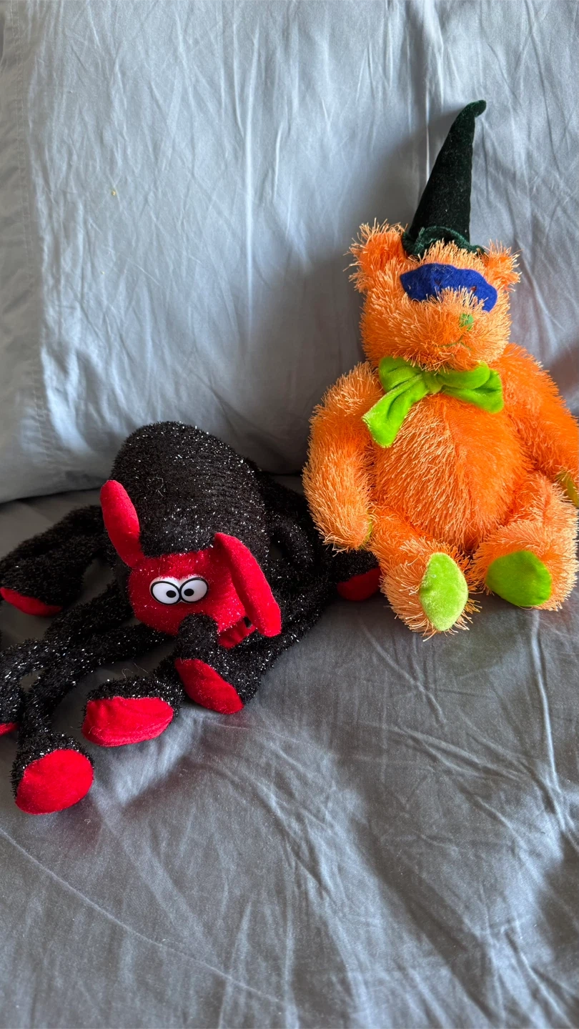 Selling these two cute Halloween plush toys! One is a fuzzy black spider with red accents, and the other is an orange bear wearing a witch hat and green bow tie. Perfect for adding a spooky touch to your Halloween decor