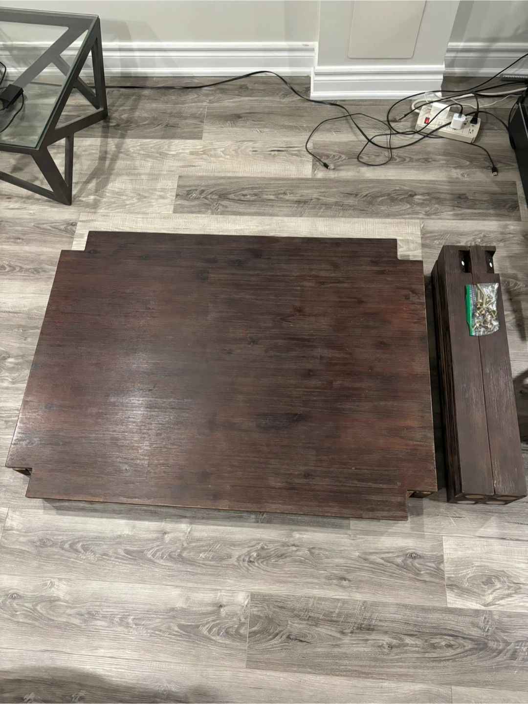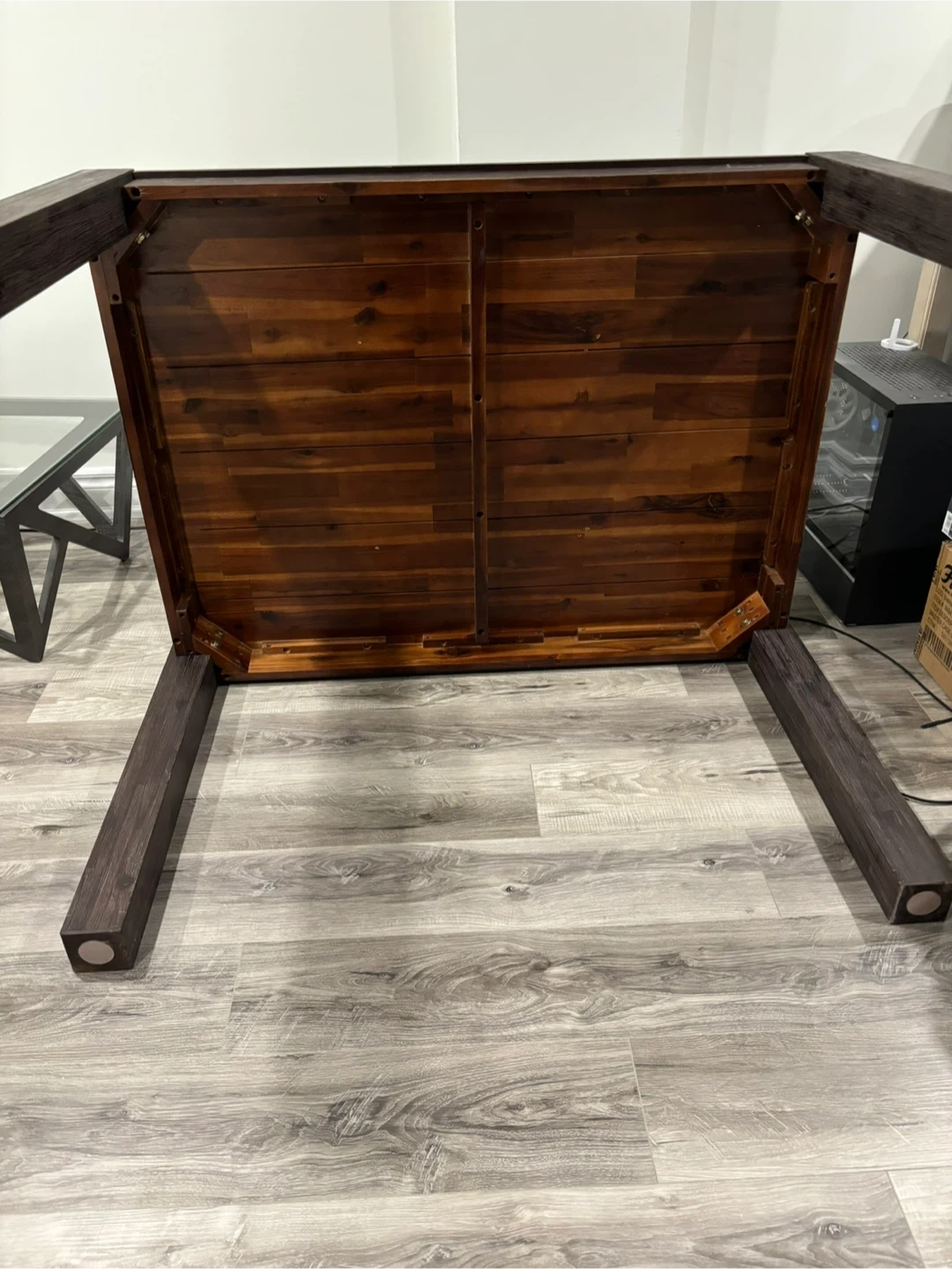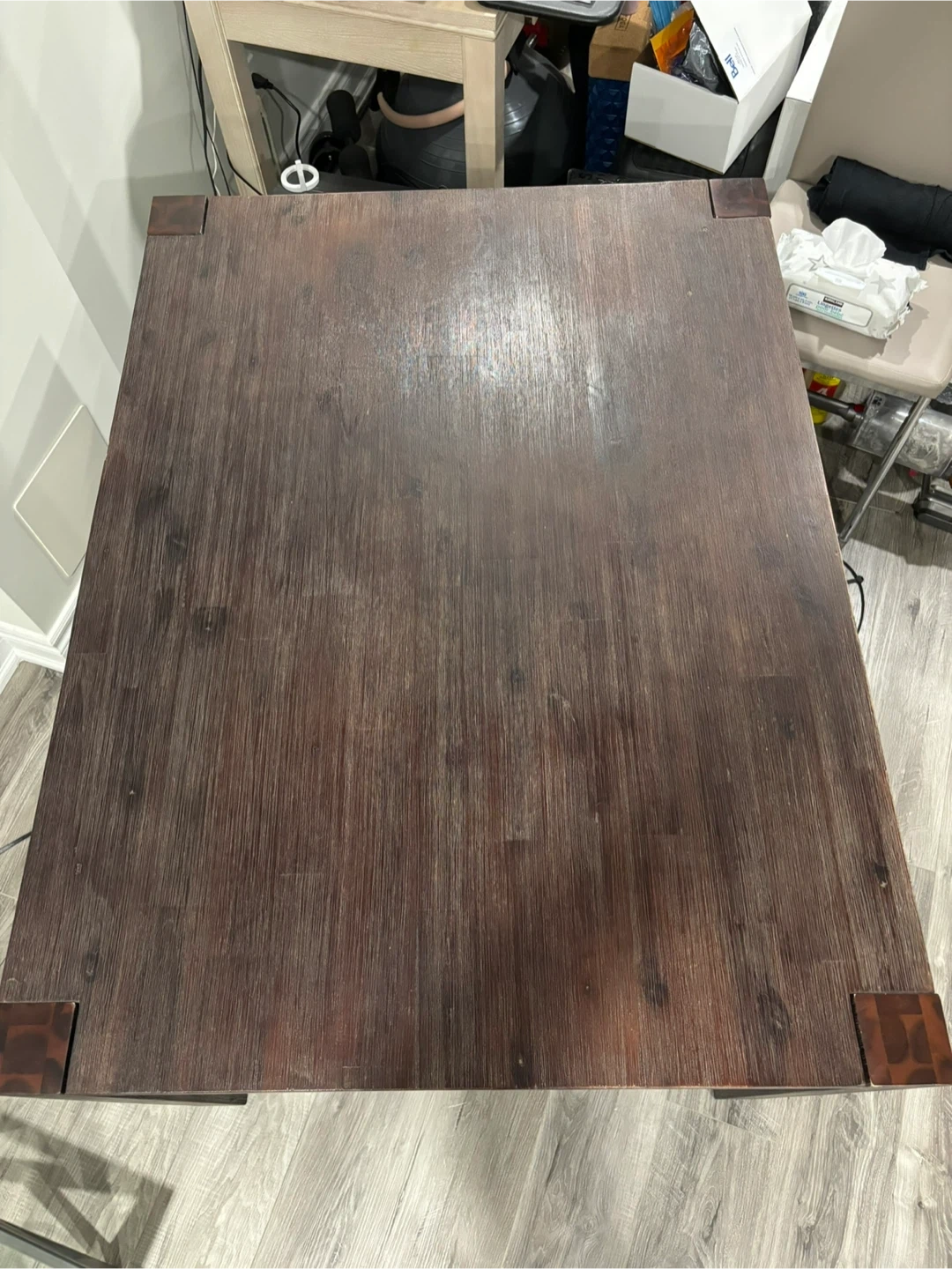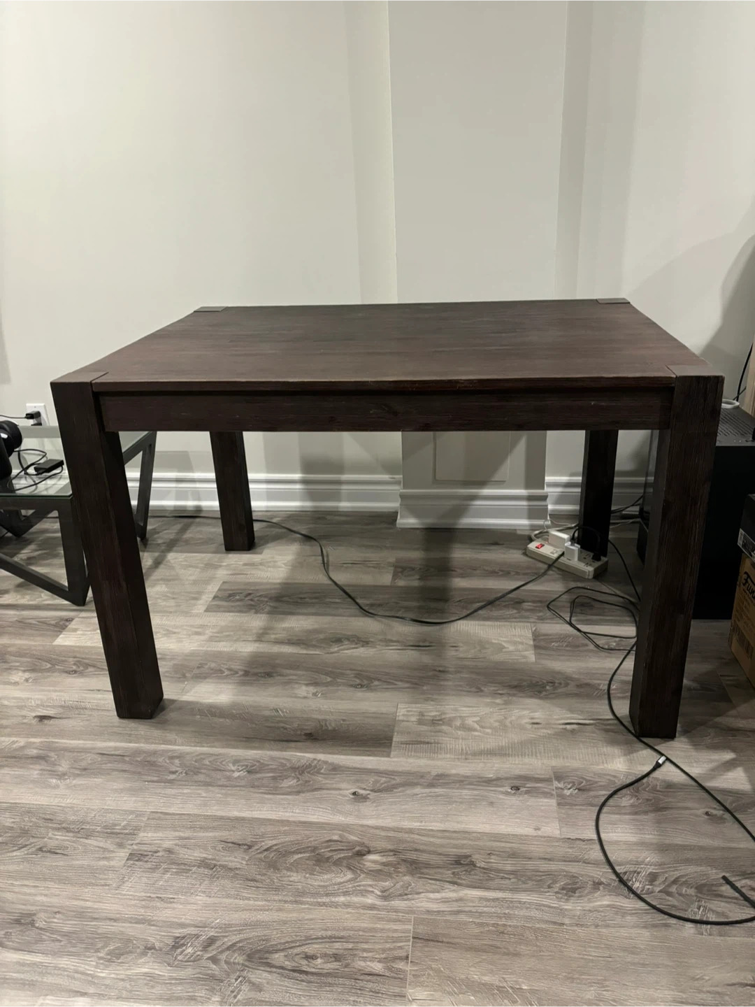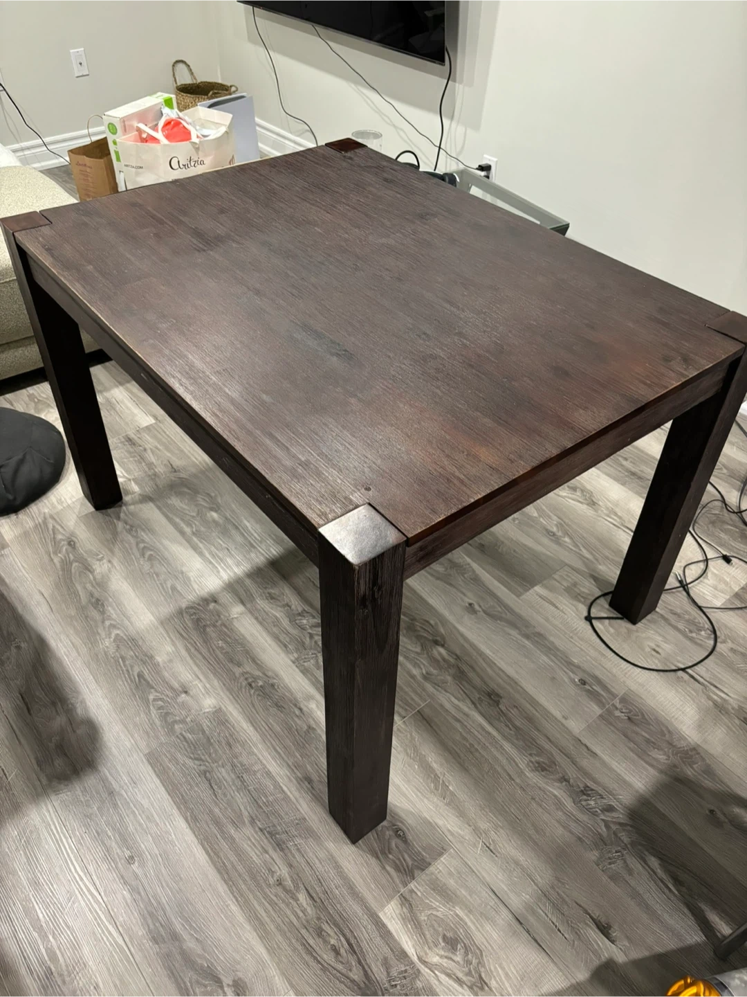 Selling a sturdy dark brown wooden dining table. It's in good condition and ready for a new home! The table has a classic design with thick legs and a smooth top. It would be a great addition to any dining room or kitchen space