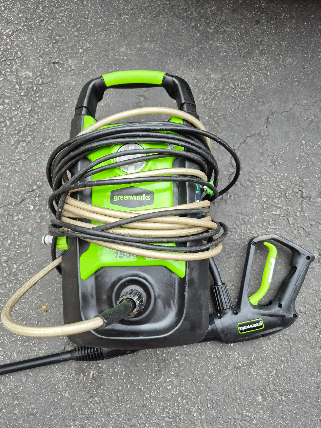 Selling a Greenworks 1500 PSI electric pressure washer! Great for cleaning cars, boats, decks, patios, and vehicles. It's lightweight and easy to move around your yard. Comes with all the original hoses and attachments, including the foam cannon dispenser. Pick it up today.