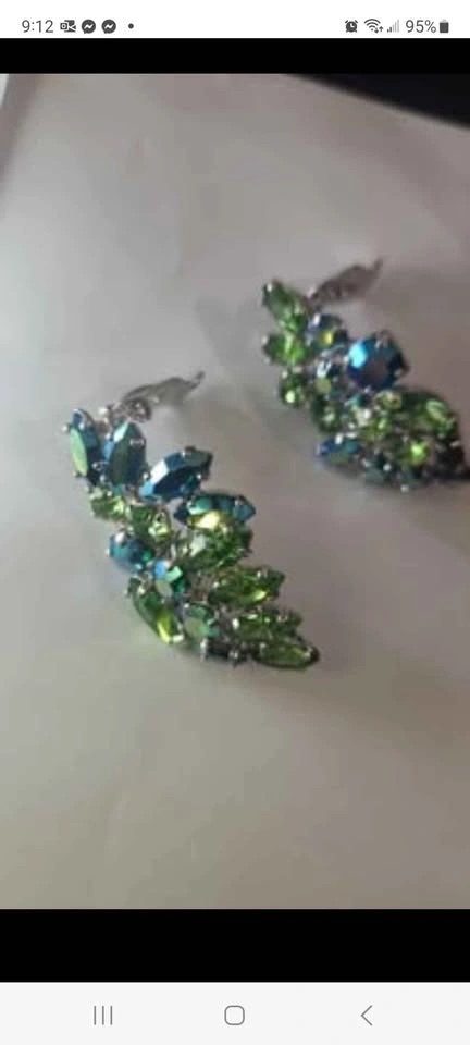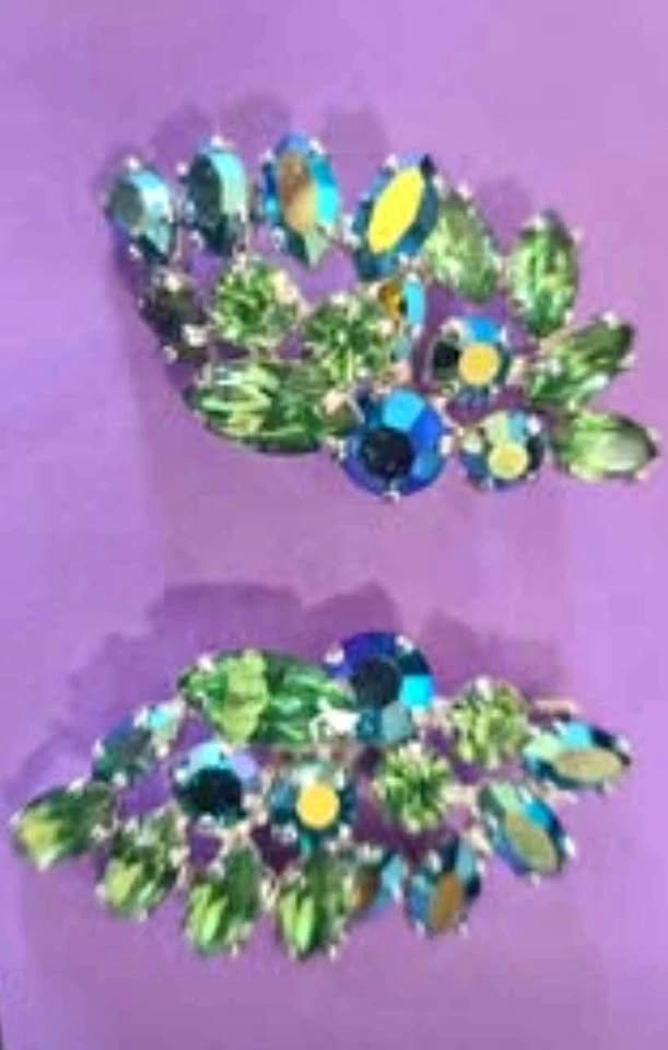 Gorgeous blue and green Aurora Borealis Vintage mid century swarovski crystal earrings clip on. Feel free to message if you have any questions!