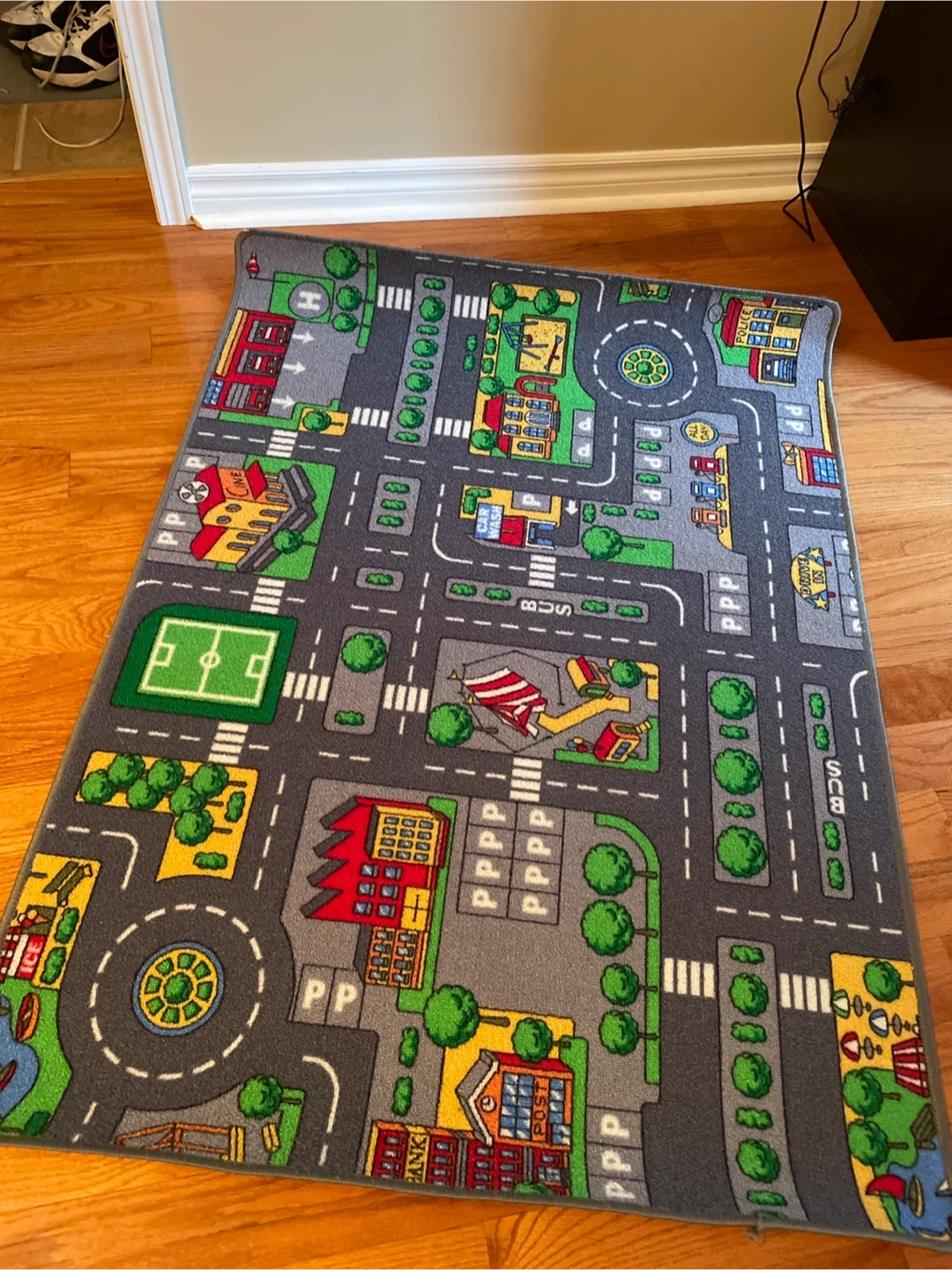 Selling a fun cityscape play mat rug for kids! It's in great shape and features a colourful town design with roads, buildings, and parks. Perfect for imaginative play and adding a touch of fun to any room. The rug is approximately 39 inches wide.