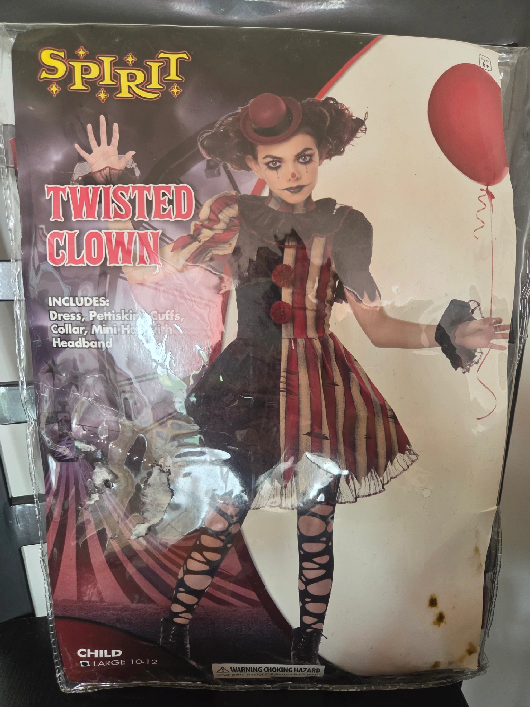 Get ready for Halloween with this Spirit Halloween Twisted Clown costume! It includes the dress, pettiskirt cuffs, collar, mini hat, and headband. The size is child large, fitting sizes 10-12. Perfect for a spooky and fun look!