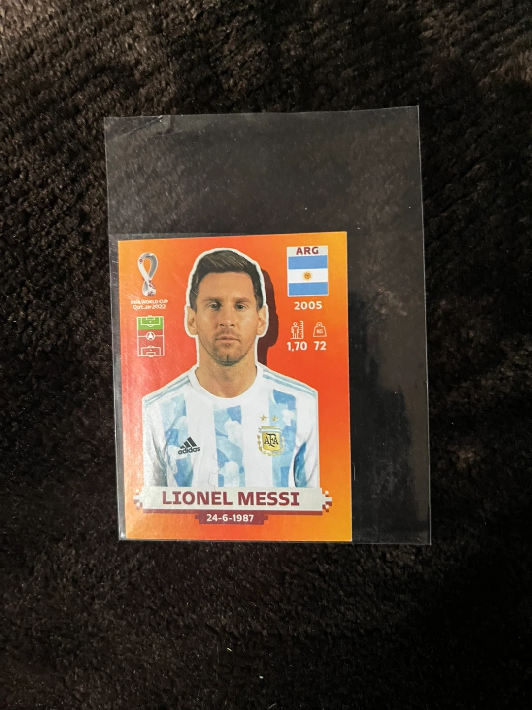 Selling a FIFA World Cup Qatar 2022 sticker of Lionel Messi! Features the Argentinian flag and details like his height (1.70m) and weight (72kg). A great collectible for any football fan