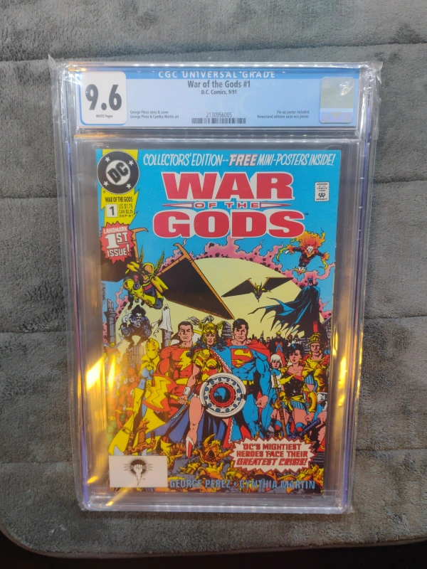 Selling a graded copy of War of the Gods #1 from DC Comics, dated September 1991. This comic is graded 9.6 by CGC. It's a collector's edition with free mini-posters inside!