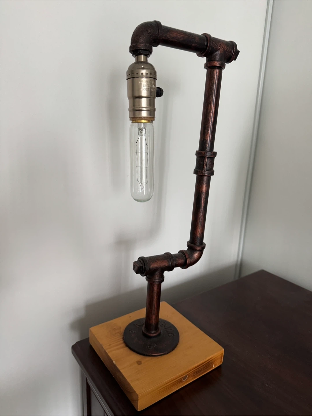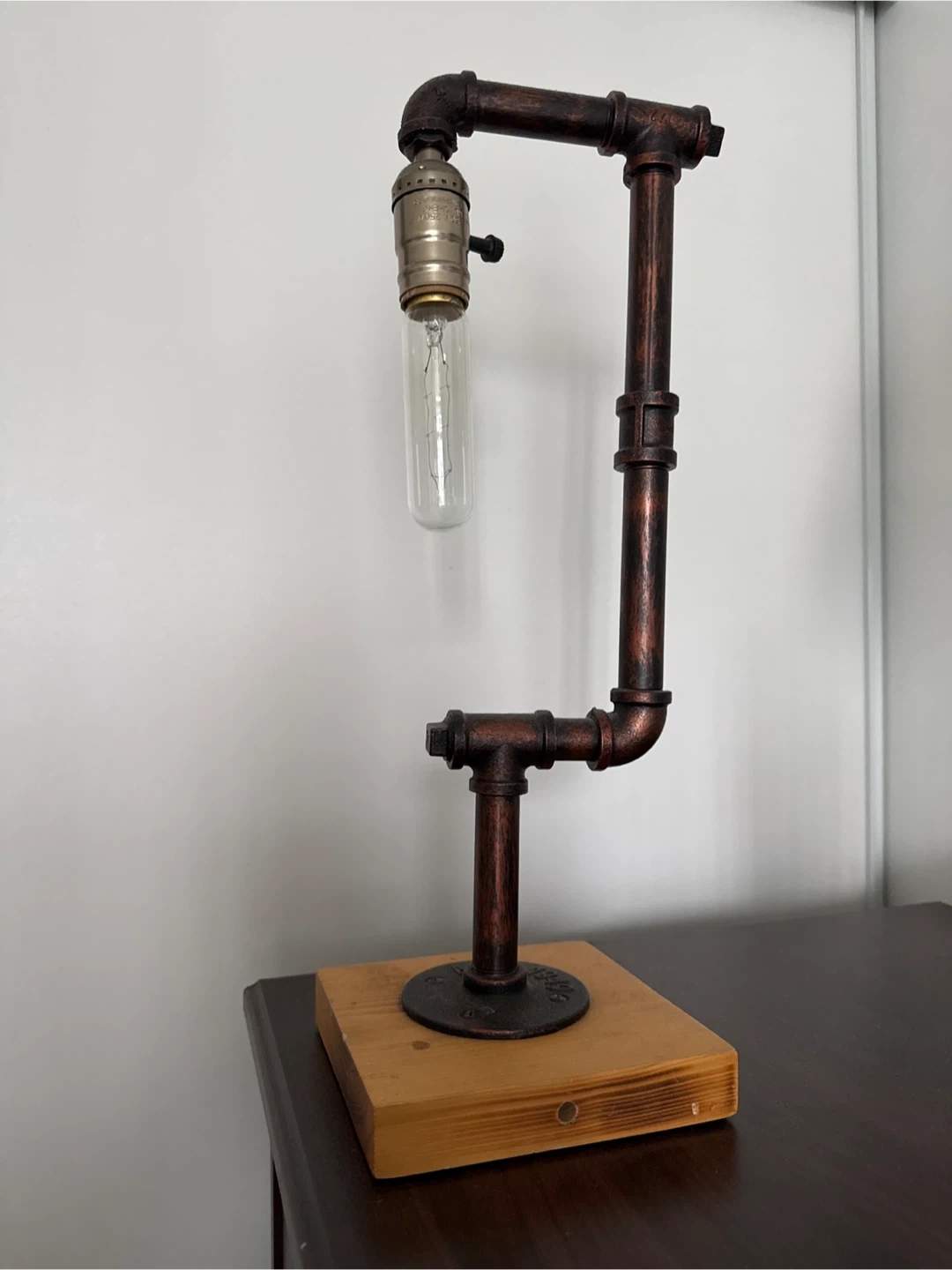 An industrial style table lamp. It's made from rustic metal pipes and has a wooden base. It would look great in any room!
