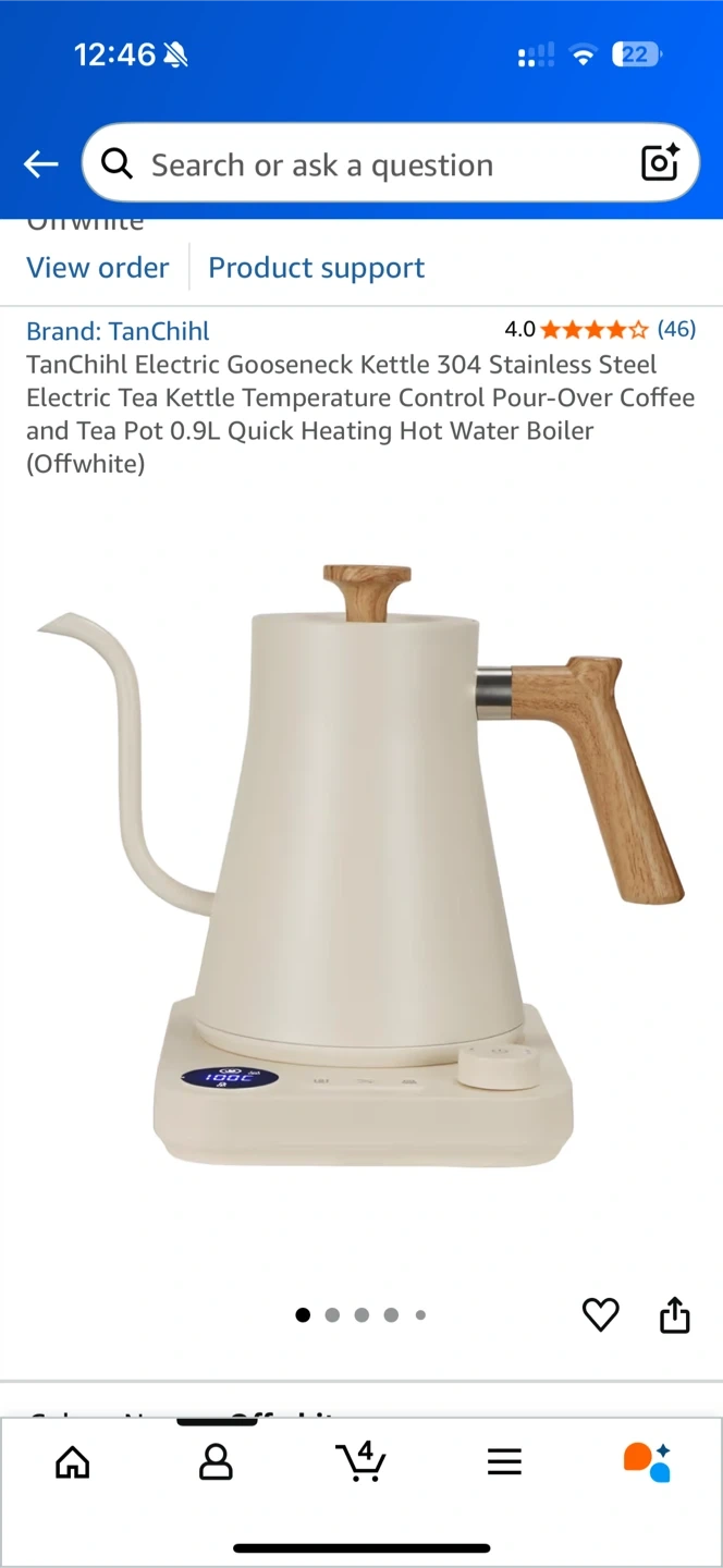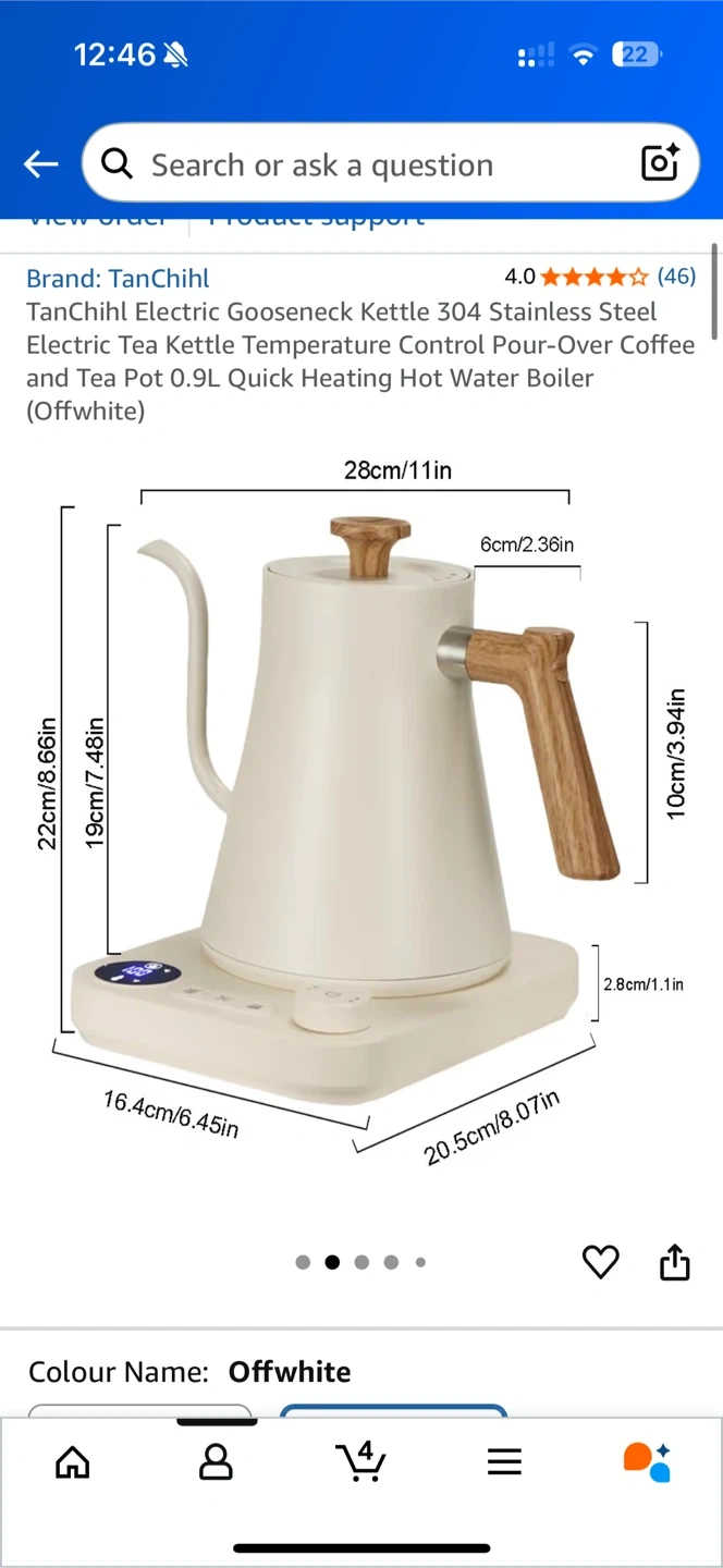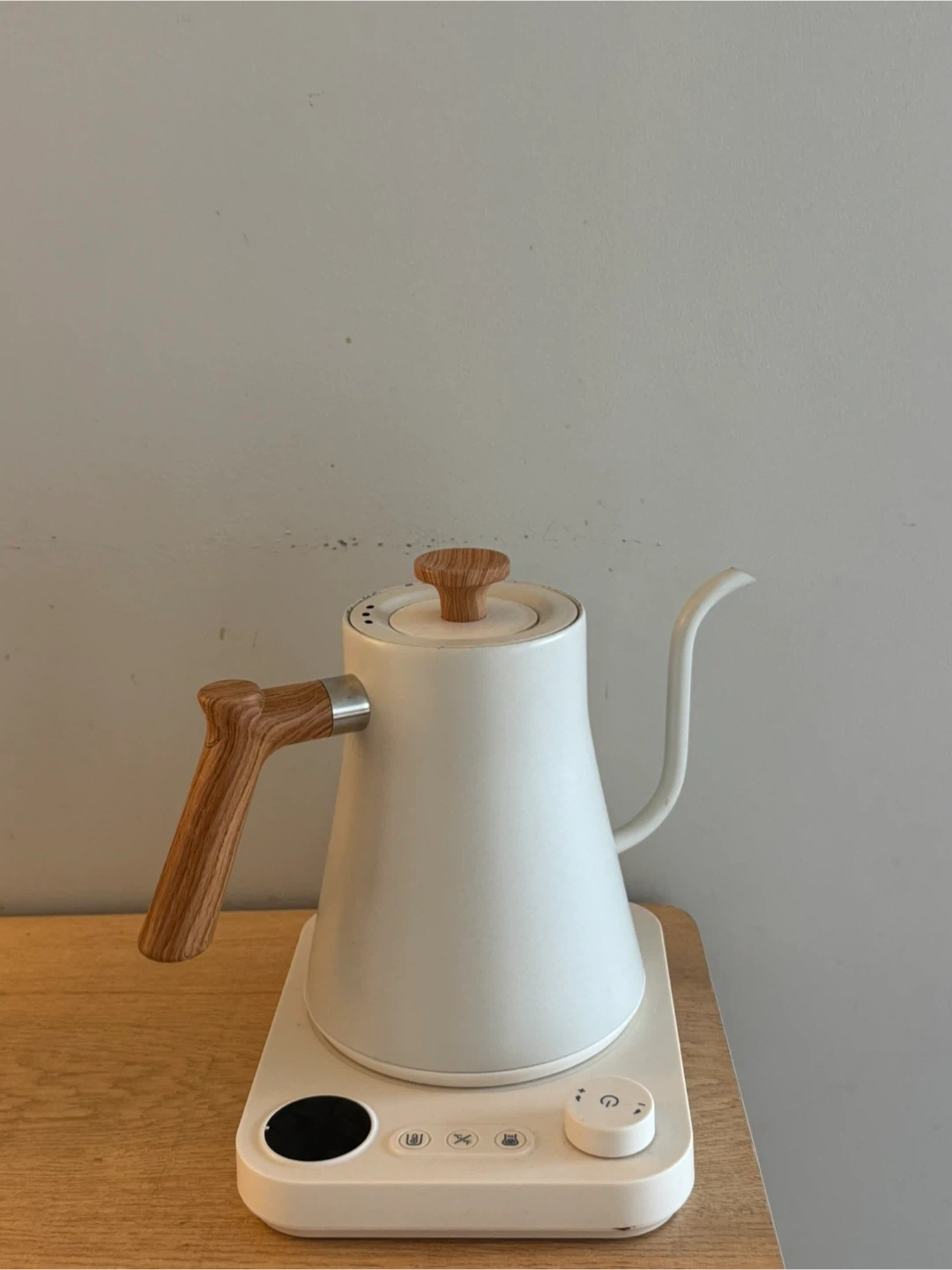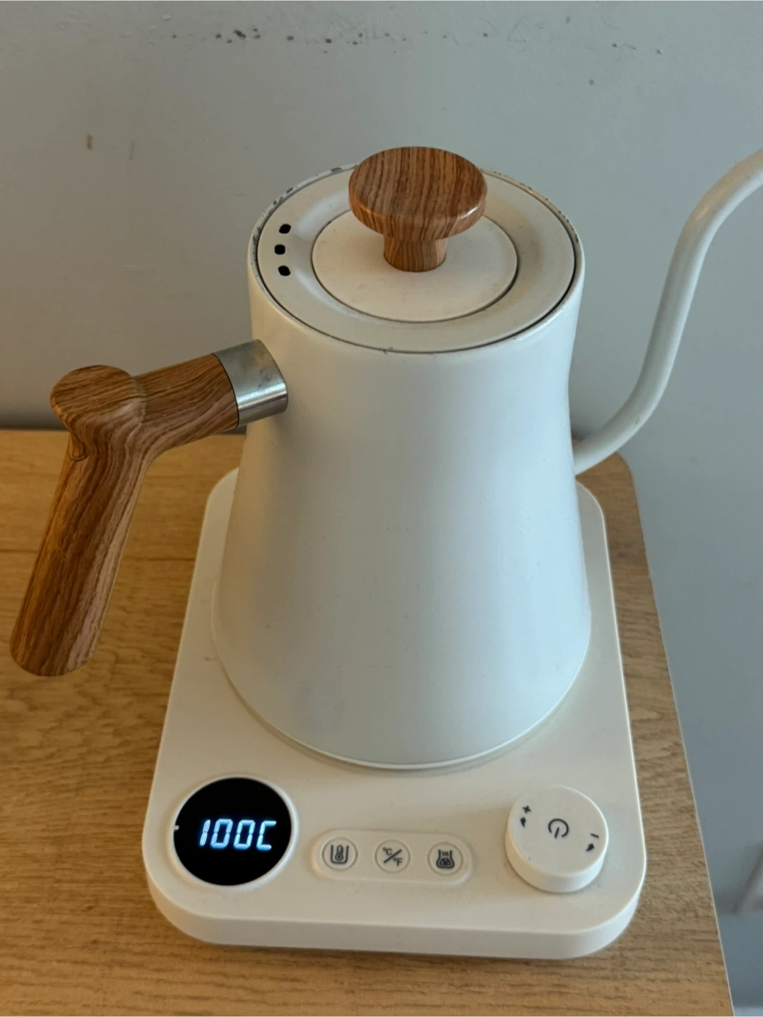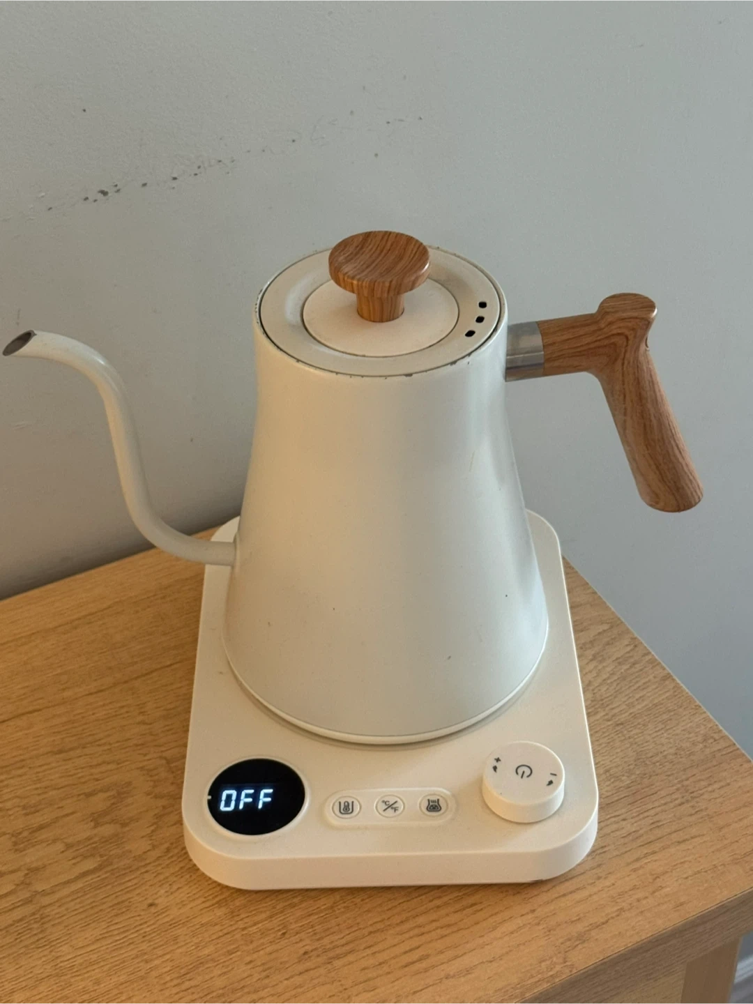 79Selling a TanChiihl electric gooseneck kettle in off-white. It's a 304 stainless steel electric tea kettle with temperature control, perfect for pour-over coffee and tea. It has a 0.9L capacity and quick heating for hot water. The dimensions are approximately 28cm/11in in height.