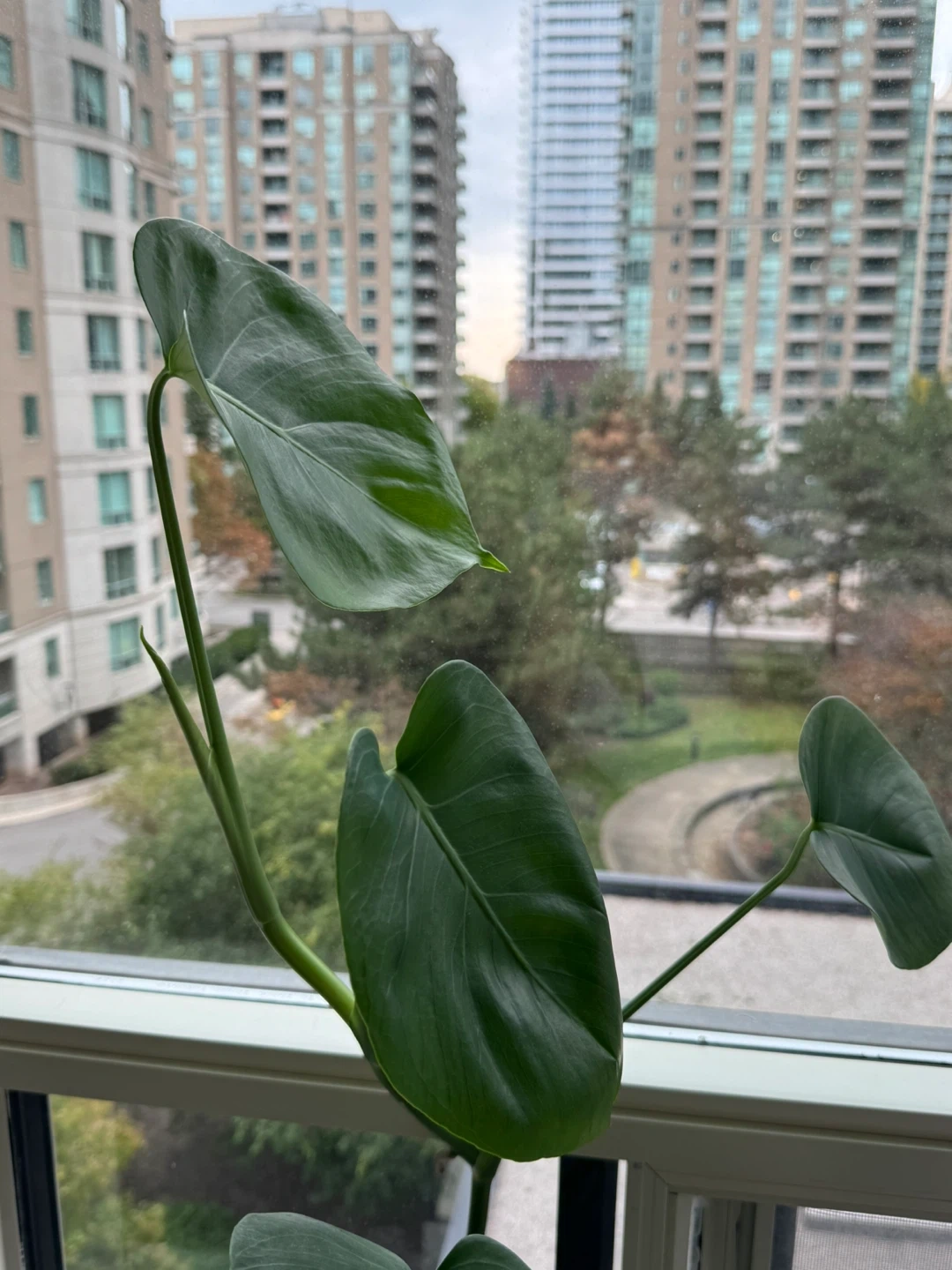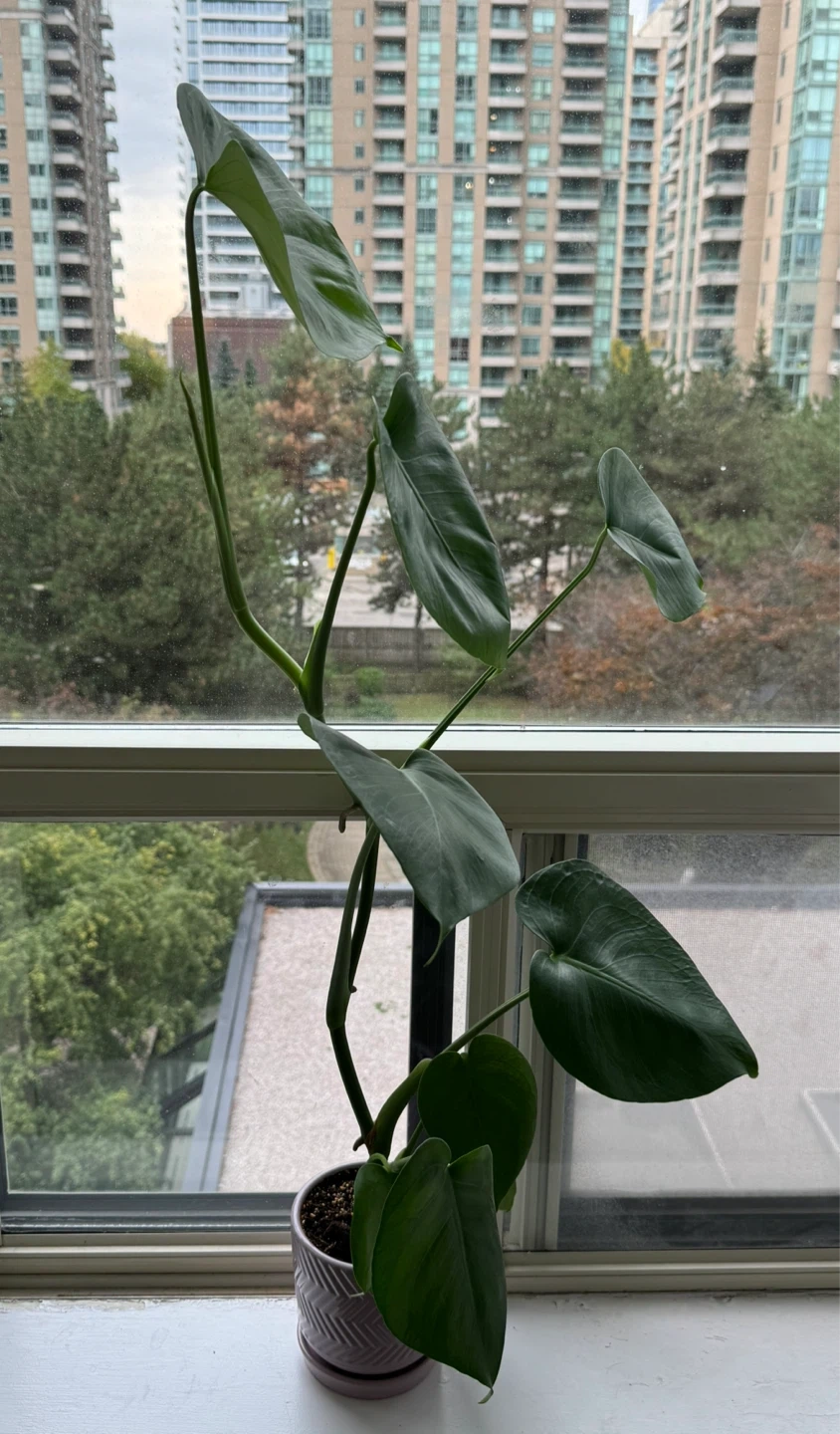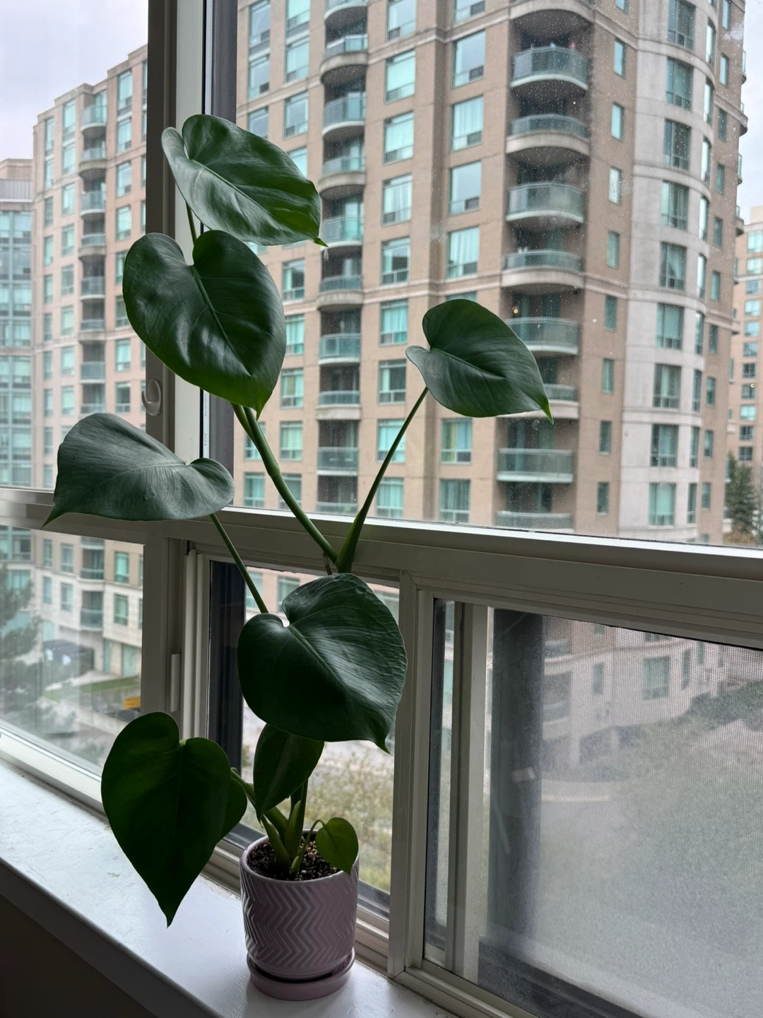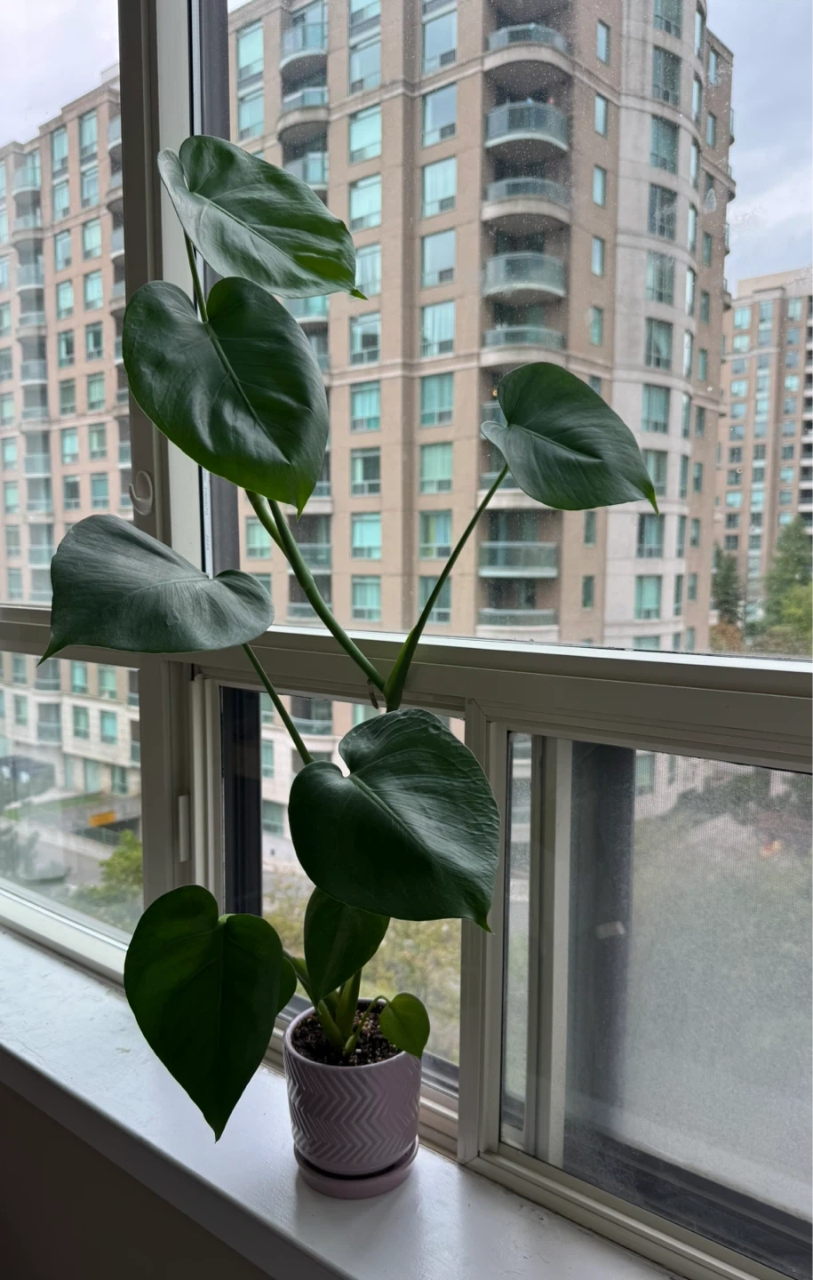 Selling a healthy monstera plant potted in a cute purple pot! It's been growing well in a bright spot and is ready for a new home. You can see the new leaf coming out!
