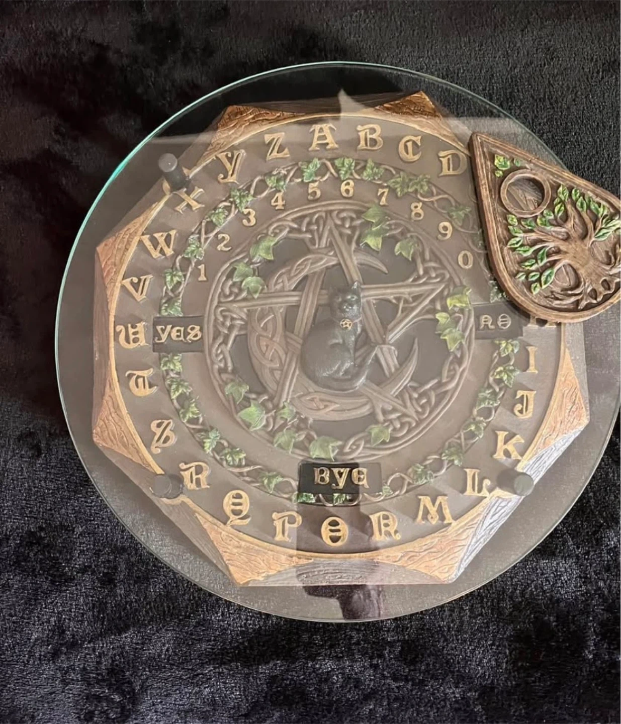 10This is a unique ouija board featuring a cat design in the center. It's a decorative and functional piece for those interested in divination or as a novelty item. The board is octagonal with letters and numbers around the perimeter and includes a planchette for communication