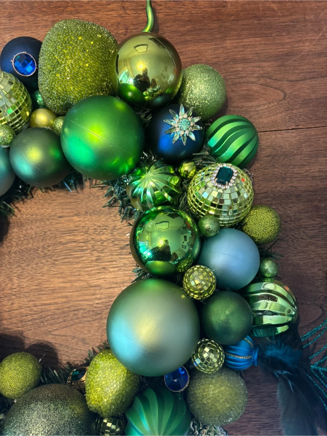 Add a touch of sparkle to your holiday decor with this beautiful Christmas ornament wreath! It features a variety of green and blue ornaments, along with a decorative peacock feather. Perfect for adding a festive touch to your front door or any room in your home. Hand made locally and brand new. 19” wide.