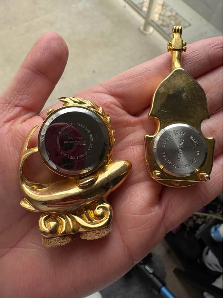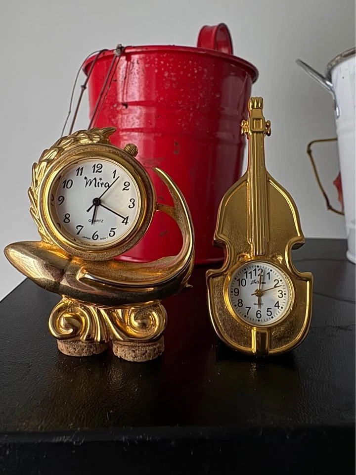 65Vintage Platinum Quartz Miniature 1.5" Tall Gold tone Fish Nightstand/Desk Clock and Vintage Miniature Brass Guitar Clock - VERY RARE AND UNIQUE Take both for $15 or $10 each Pick up in Brighton!