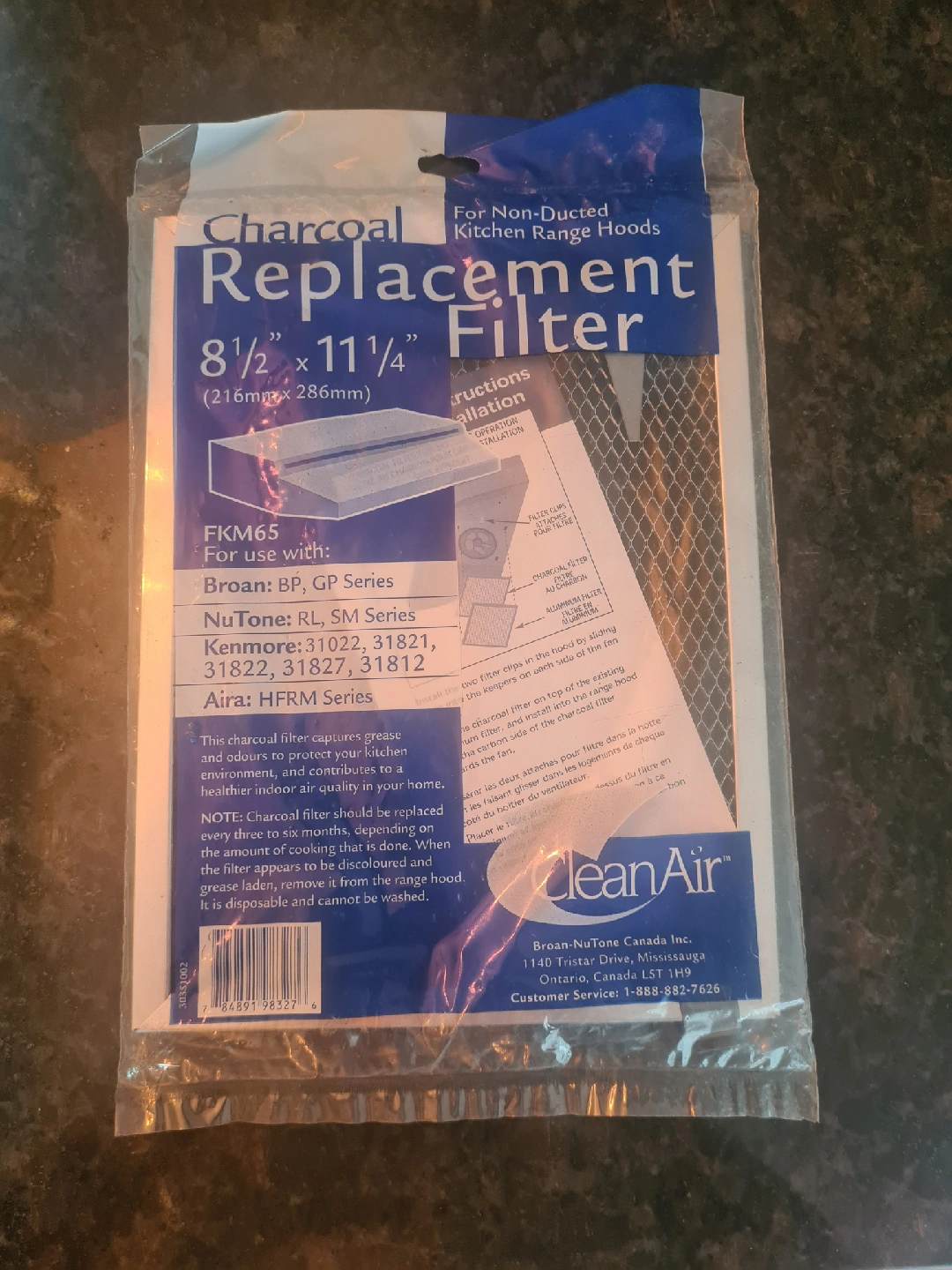 non-ducted kitchen range hoods and measures 8 1/2" x 11 1/4" (216mm x 286mm). It's compatible with Broan BP, GP Series, NuTone RL, SM Series, Kenmore 31022, 31821, 31822, 31827, 31812, and Aira HFRM Series hoods.