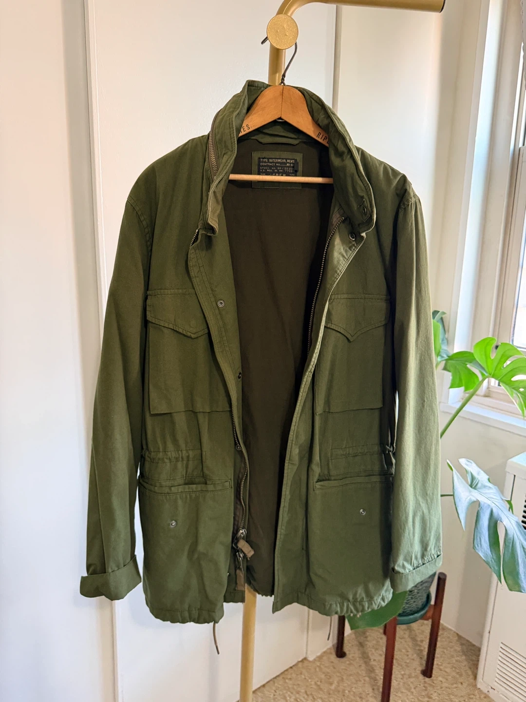 Selling a J.Crew men's field mechanic jacket in olive green. It's a size medium and appears to be in great condition. Perfect for layering or wearing on its own!