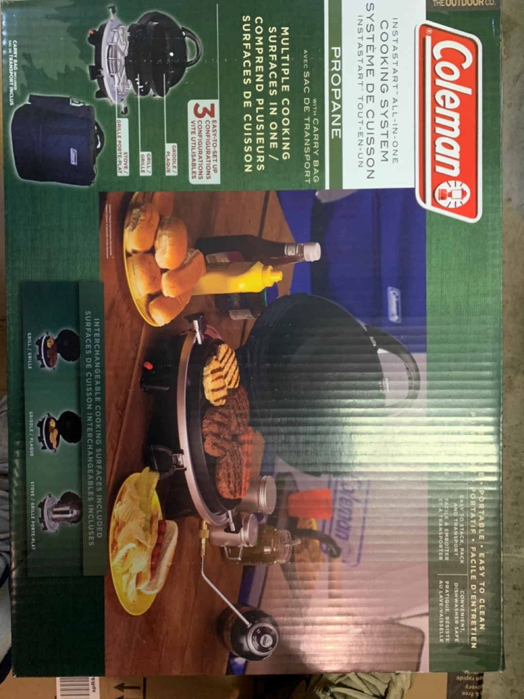 103Selling a Coleman All-In-One Cooking System! It features interchangeable cooking surfaces and comes with a carry bag for easy transport. Perfect for camping or backyard BBQs! Easy to set up and clean, this portable cooking system is ready for your next adventure. Brand new in the box. Compatible retail is $149.99 at CTC
