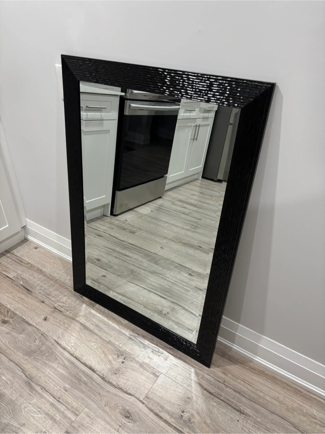 60Selling a black framed mirror. It's in great condition and ready to brighten up your space! The frame has a textured design.