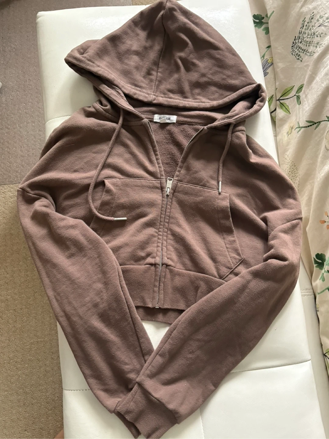 Selling a brown cropped zip-up hoodie from Garage! It's in great condition and perfect for layering or wearing on its own. The colour is a lovely neutral brown that goes with everything