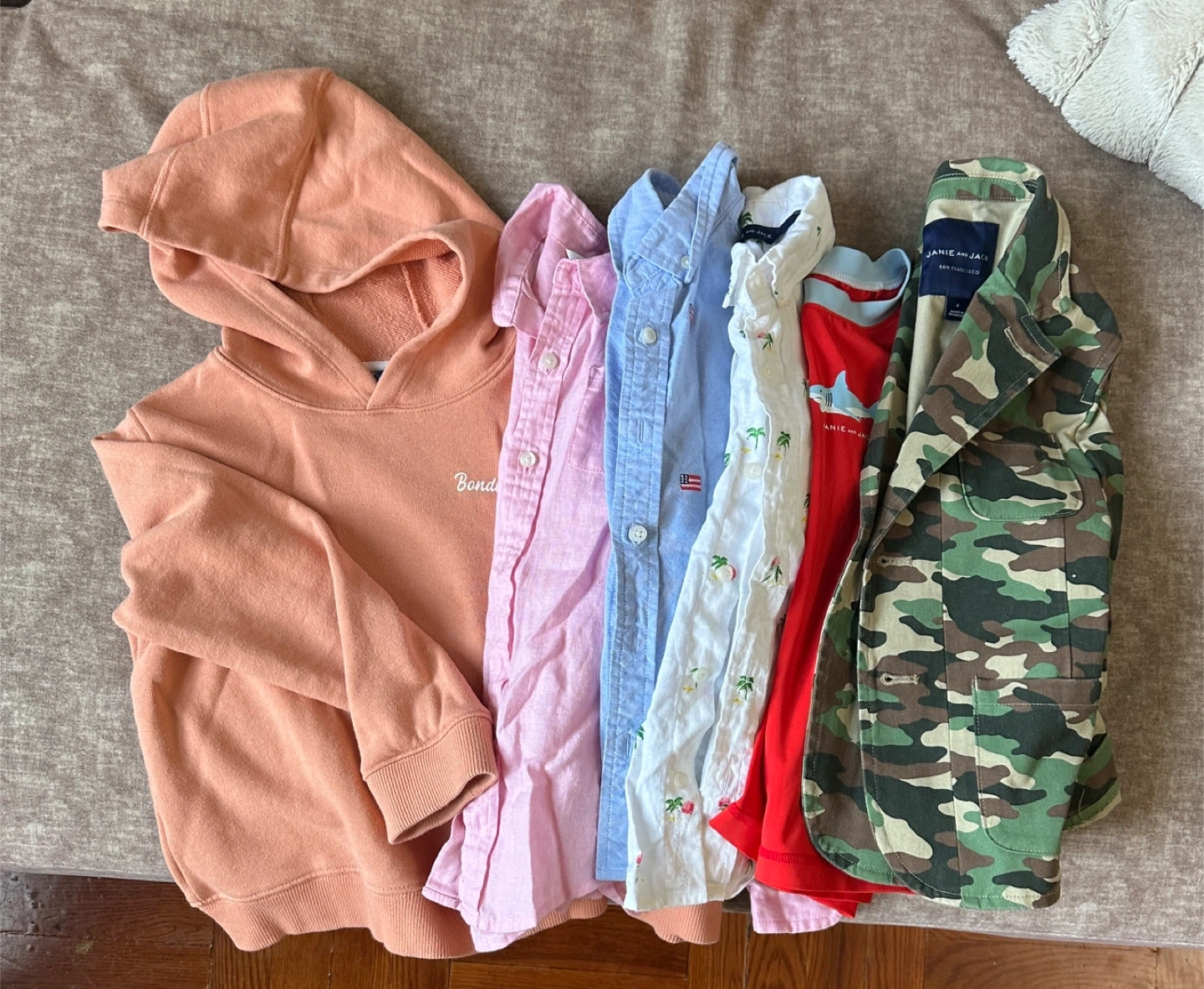 Selling a bundle of Janie and Jack kids clothes in size 5! Includes a hoodie, button-down shirts, and a patterned jacket. Perfect for your little one!
