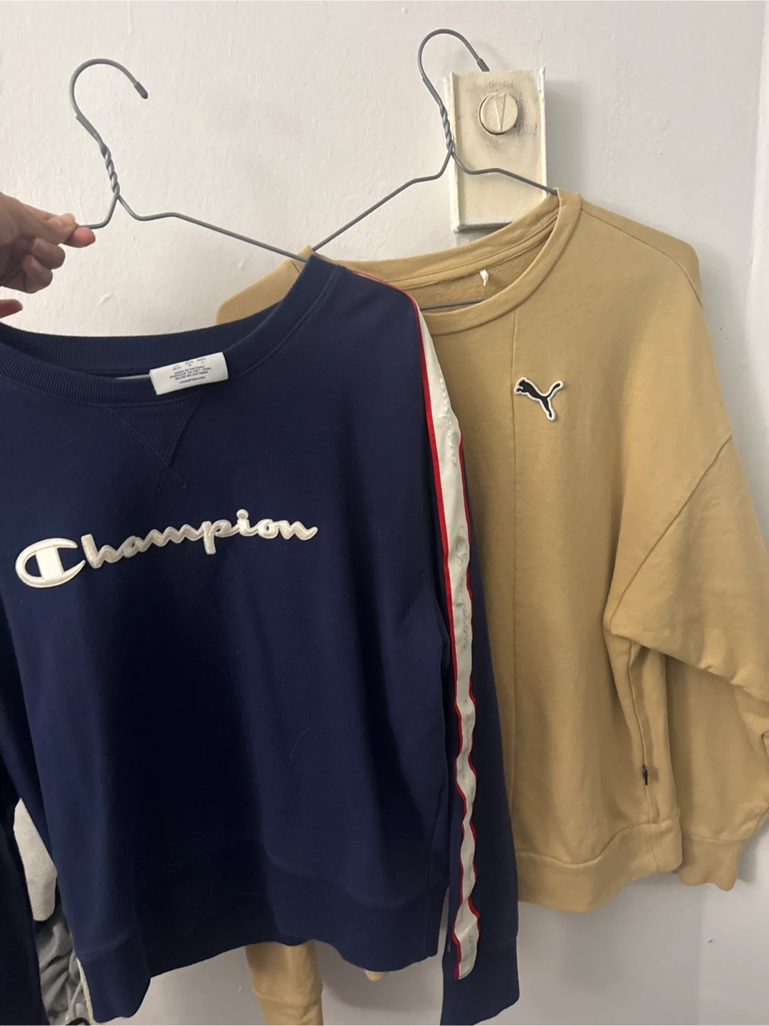 A collection of assorted t-shirts and sweaters from brands like Nike, Champion, Puma, and Pacsun. Various colours and styles available. Perfect for casual wear!