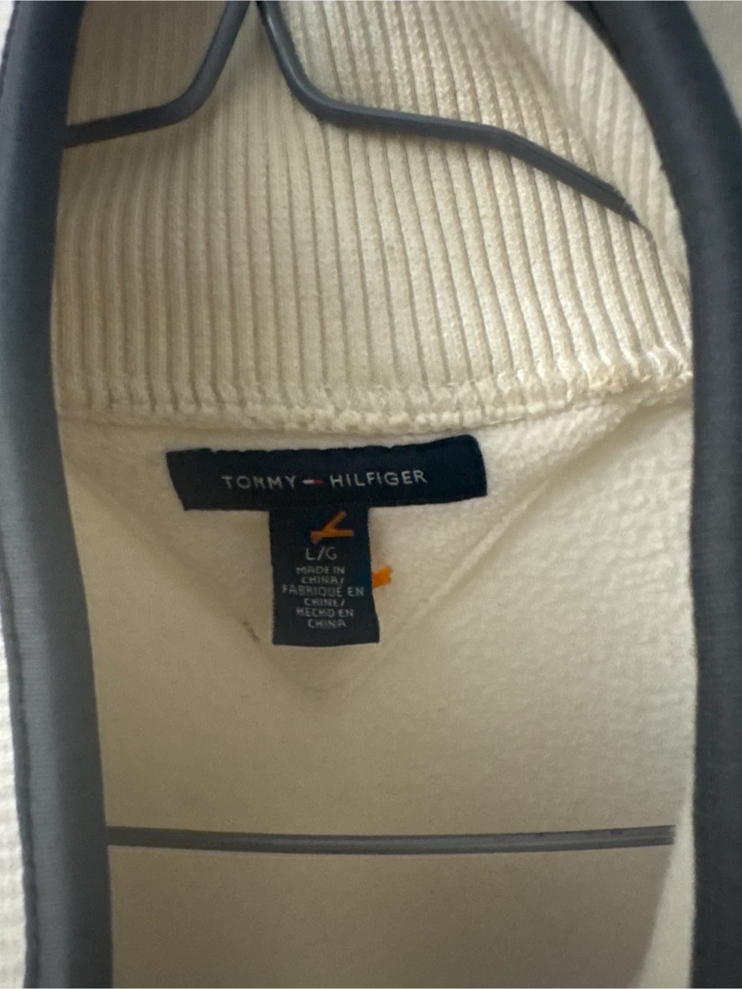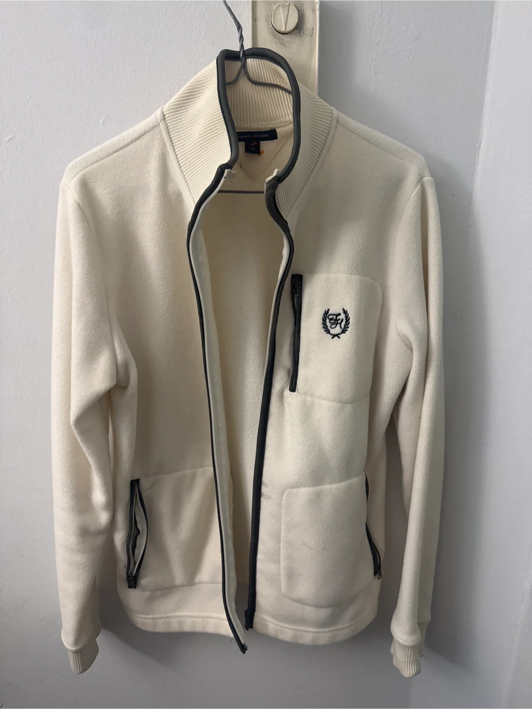 Selling a Tommy Hilfiger fleece jacket in size large. It's a cream/off-white colour with black detailing around the zipper and collar. Has a logo on the pocket. It's super cozy and perfect for layering!