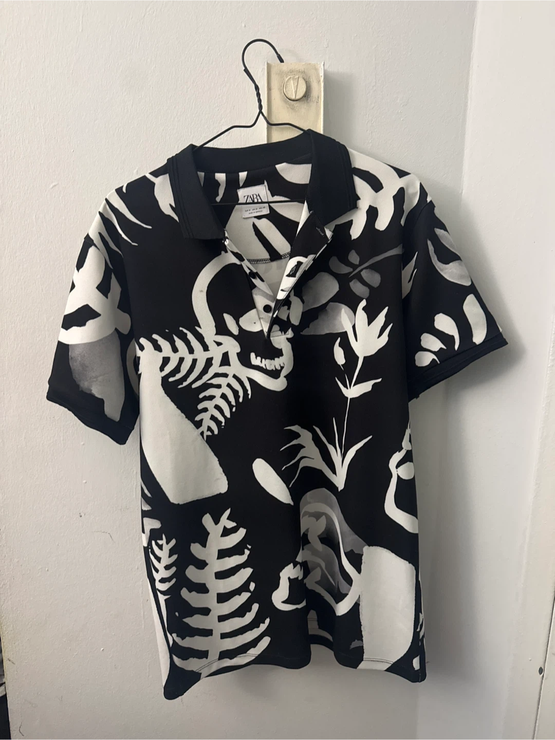 Selling a Zara polo shirt with a cool black and white pattern. It's a size medium and made in Morocco. Perfect for adding a bit of style to your wardrobe!