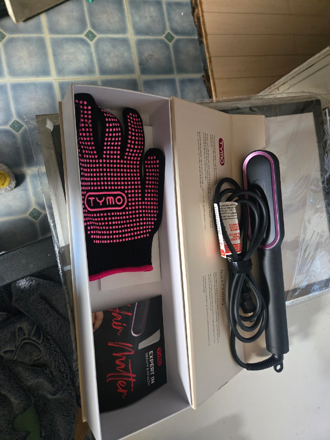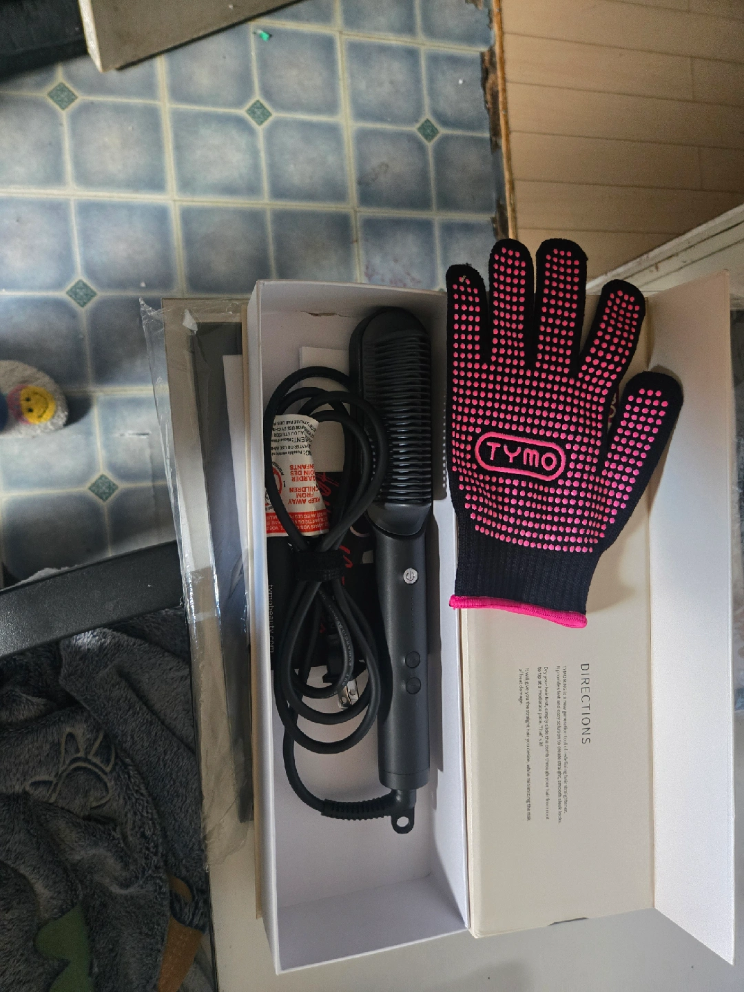Selling a TYMO Ring hair straightening comb. It comes with the box and a heat-resistant glove. It's in great condition and ready to use!