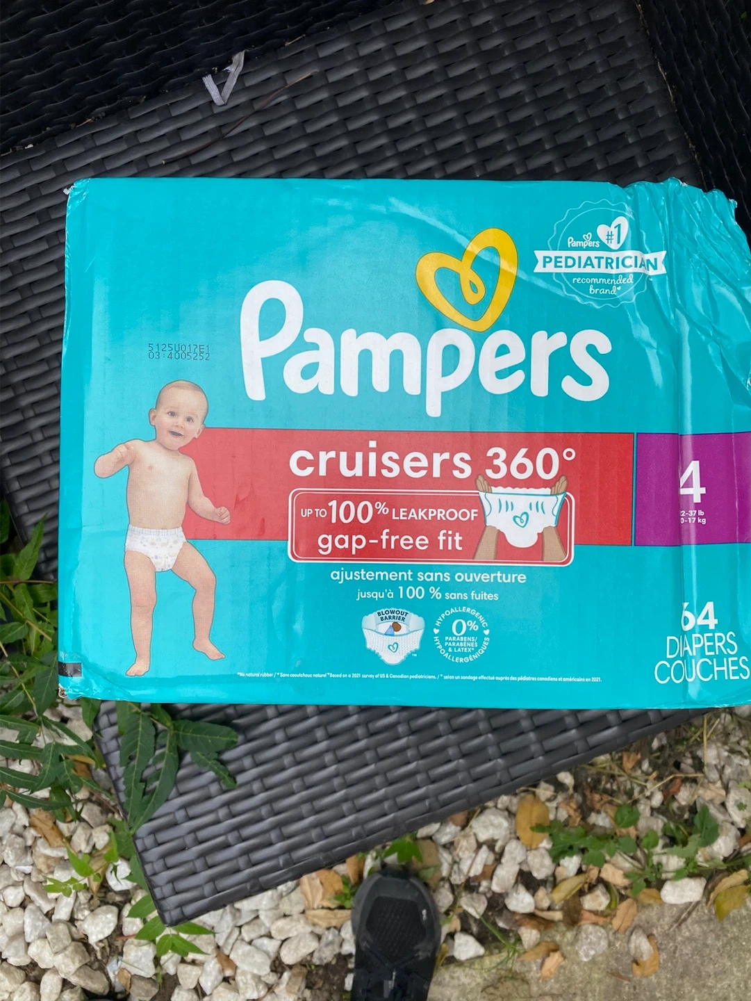 Selling a pack of Pampers Cruisers 360° diapers, size 4. These are designed for babies weighing 2-37 lbs (0-17 kg). The pack contains 64 diapers and features up to 100% leakproof protection with a gap-free fit. They are also hypoallergenic and free of parabens and latex