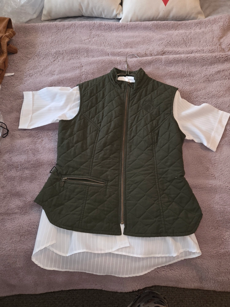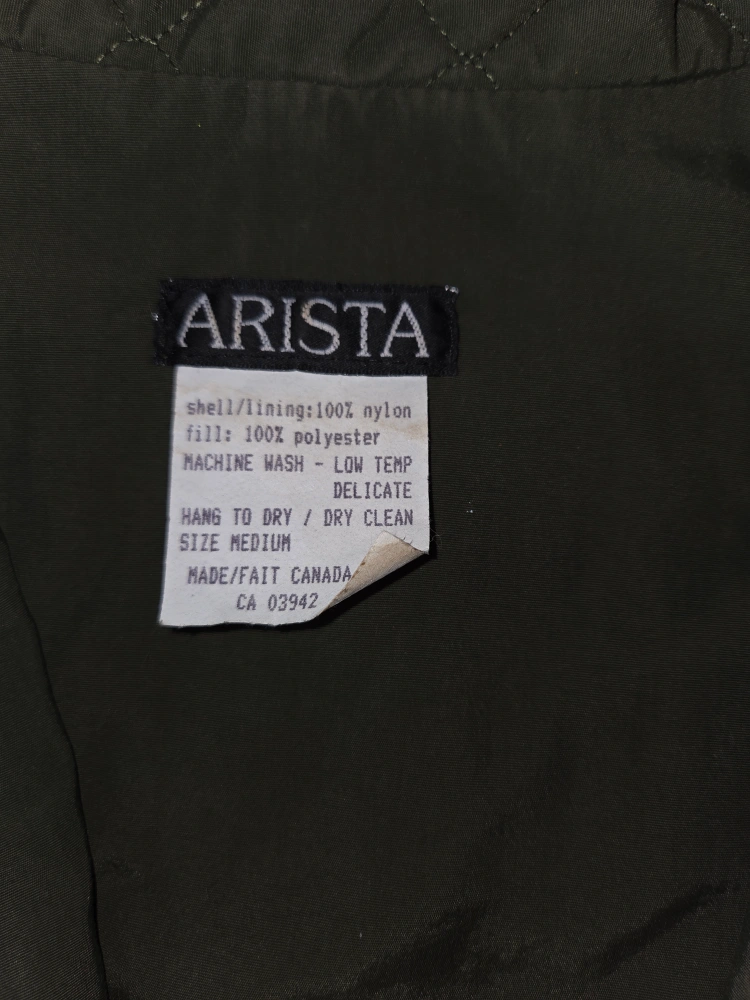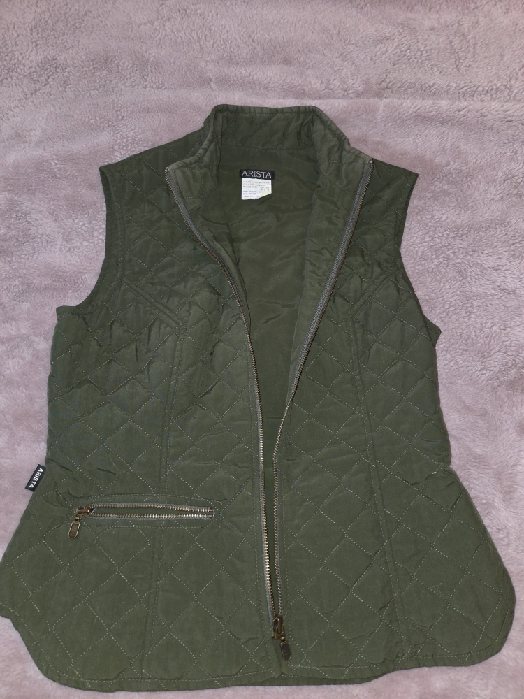 Arista quilted vest in a lovely olive green colour. It's a size medium and made in Canada. The shell and lining are 100% nylon, with 100% polyester fill. Features a stylish quilted pattern and a convenient zipper closure. includes short sleeved white dress shirt. perfect for your equestrian.