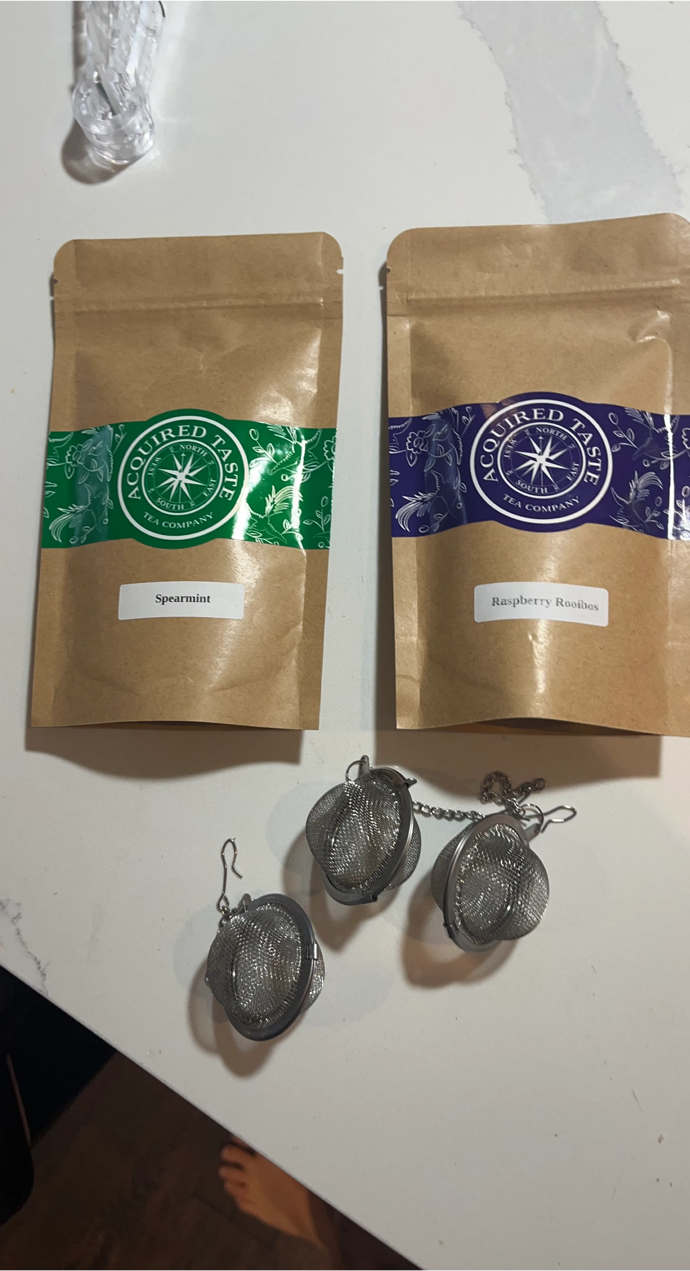 Selling two bags of Acquired Taste Tea! One is Spearmint and the other is Raspberry Rooibos. Both are in sealed bags and ready to be enjoyed. Also included are three stainless steel tea infusers to steep your tea with