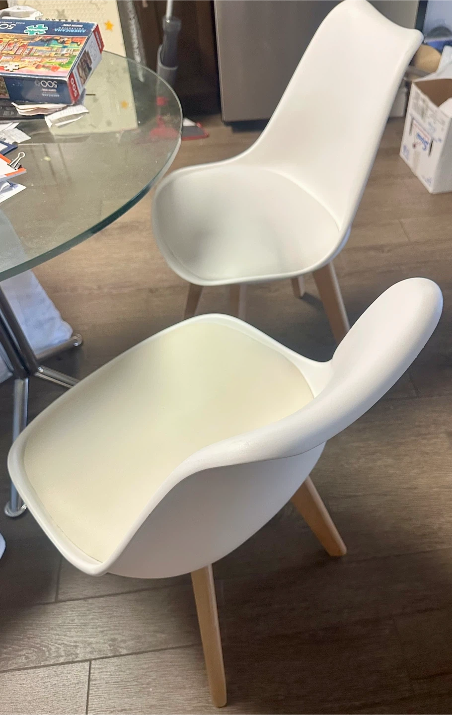 Selling a set of two dining chairs! They feature a clean, modern design with white seats and natural wood legs. Perfect for adding a stylish touch to your dining area or kitchen. They are in great condition and ready for a new home